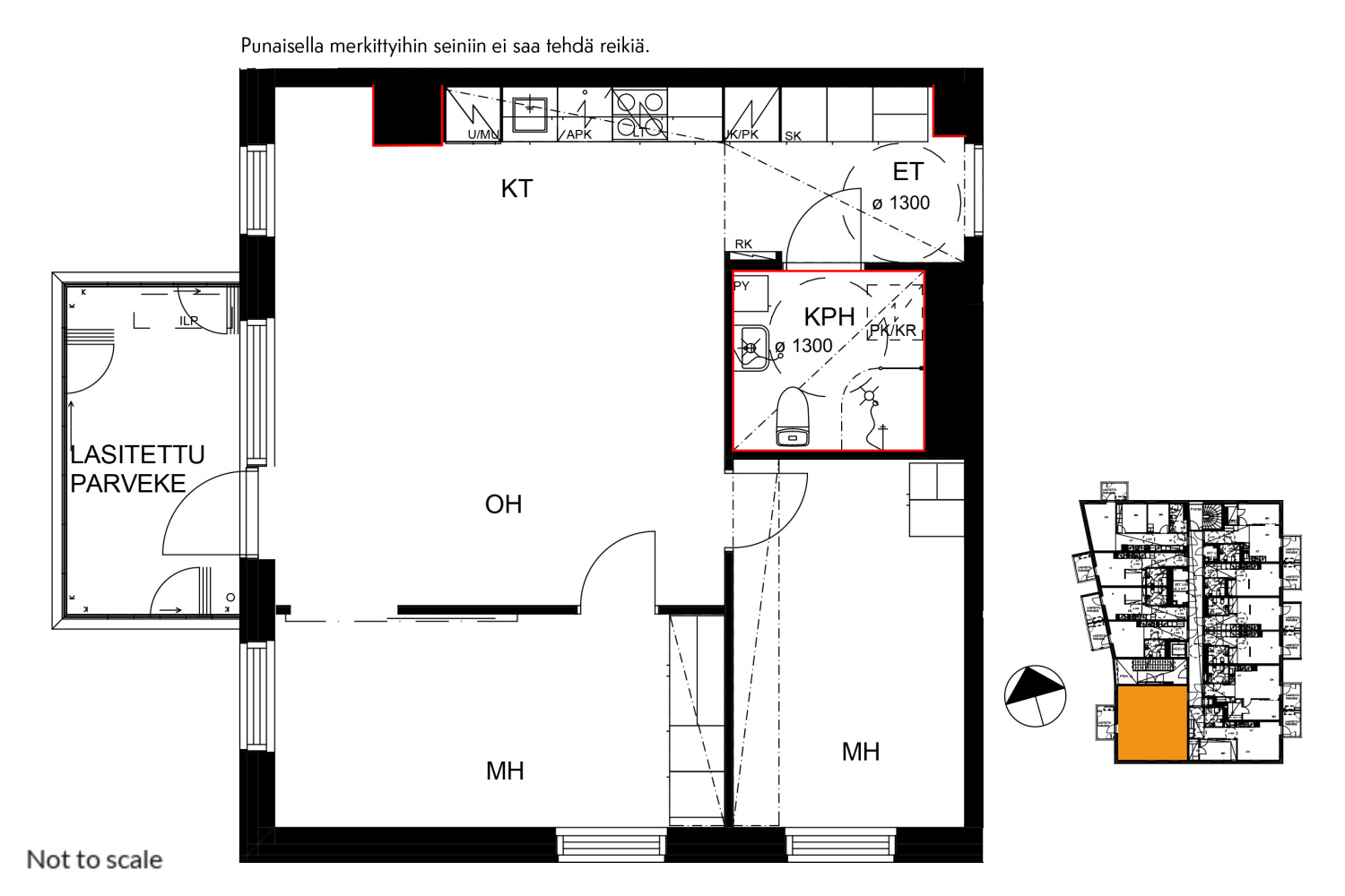 The kitchen is conveniently located at the other end of the living room, yet it remains part of the same open space. The well-equipped kitchen is a joy for cooking: a dishwasher takes care of the dishes, and the ceramic hob is easy to keep clean. There is also a designated spot for a microwave.