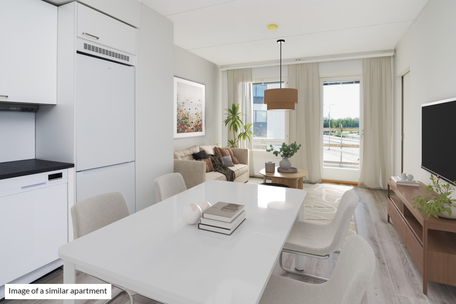 The living room and kitchen create a functional living space. In the summer, the area expands to the east-facing glazed balcony.