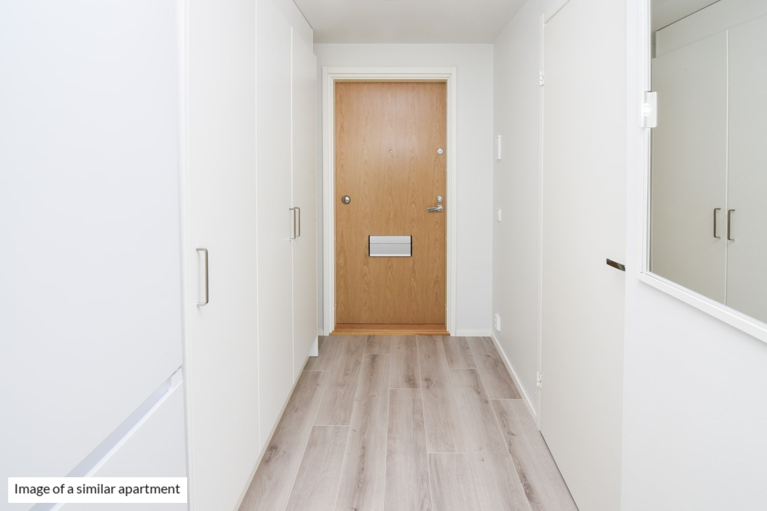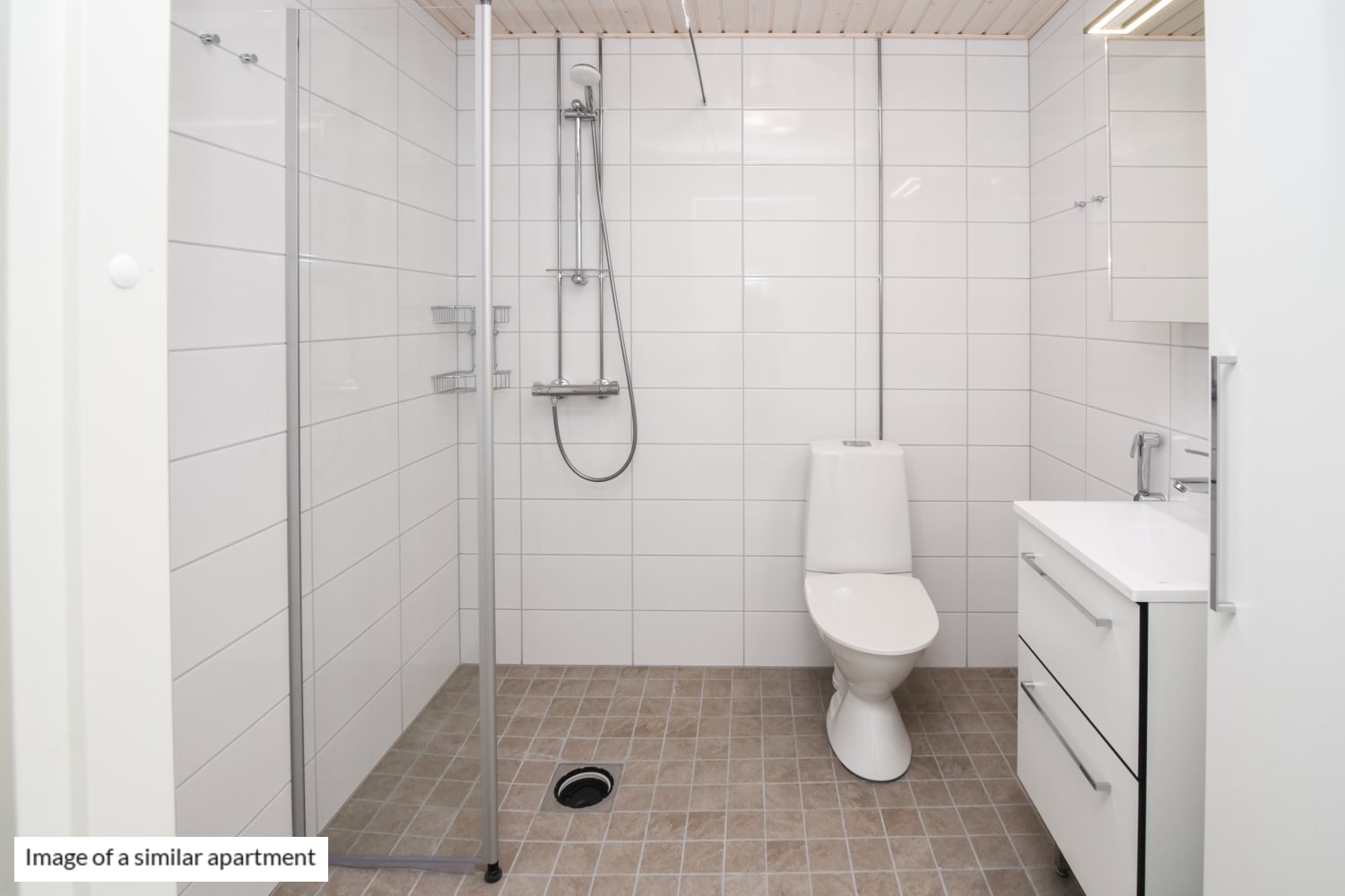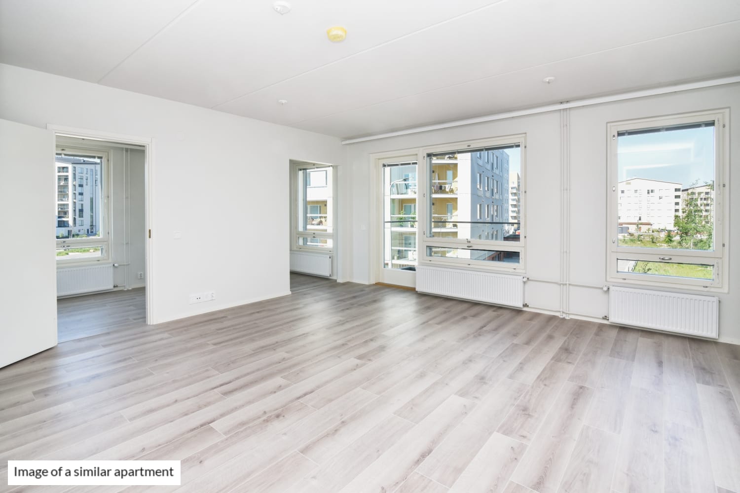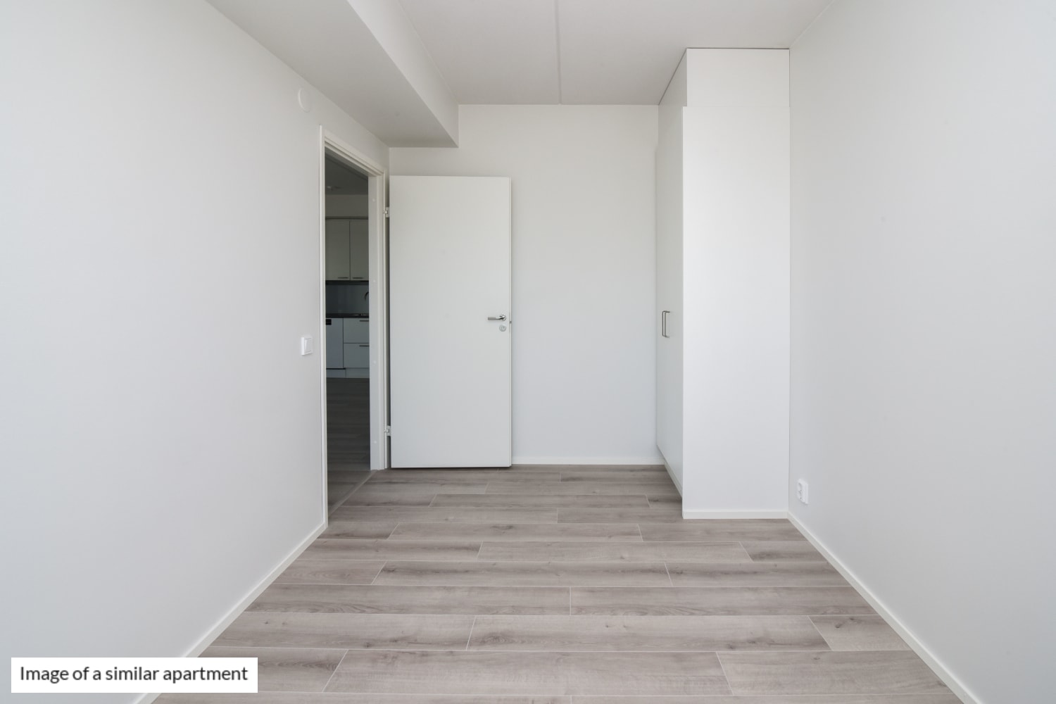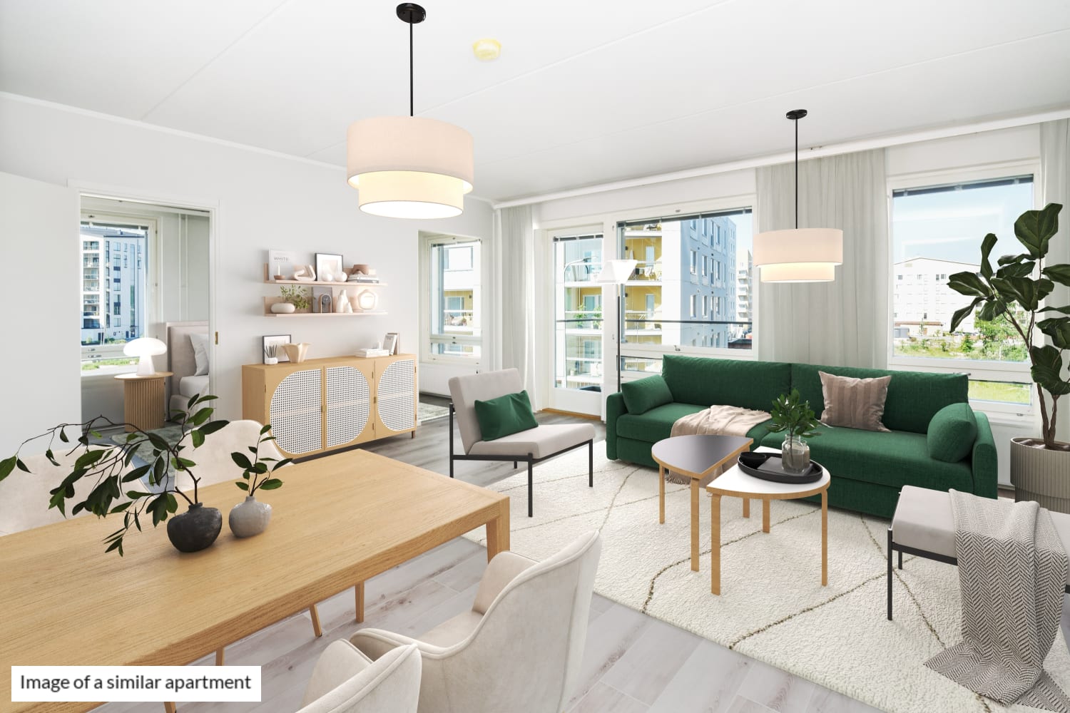The floors are light oak laminate and the baseboards are white, walls painted white. The windows have white Venetian blinds with double-track curtain rails. The wardrobe doors are white. The kitchen cabinets have white doors, and the countertop and backsplash are made of brushed copper composite. Kitchens are equipped with a 50/60 cm wide ceramic hob, a 45/60 cm dishwasher, a fridge-freezer or a separate fridge and freezer, a cooker hood, and a space reserved for a microwave all in white. The bathrooms are tiled: the floor is matte grey 10x10 and the walls are glossy white 20x40 tiles. The ceilings of the wet areas are alder and painted white. The bathroom cabinets are Finnish Kide bathroom furniture. There is space and connections for a washing machine and dryer. The balconies have concrete element floors. The railings are metal-framed glass railings. Above the railing are opening balcony windows. Balconies and terraces are equipped with a socket and a drying rack. The apartments have central mechanical ventilation. The building has an intercom system and an iLOQ locking system. Heating is provided by water-circulating radiators connected to the district heating network. The tiled floors in the bathrooms and saunas have water-circulating underfloor heating. The civil defense shelters/storage rooms, outdoor equipment storage rooms, and pram storage rooms are located on the first floor of the building. Some storage rooms are located in the upper floors along the corridor. The club room, building saunas, and laundry rooms with drying rooms are located on the 13th floor. The club room has a glazed balcony. The yard has plantings, bicycle parking, carpet dusting racks, children's play areas, and seating areas. The courtyard area is shared by the block. Waste collection points implemented with Molok containers are located on the north side of the courtyard deck and in the southwest corner of the block, shared with Peijinkuja 6A and 6B.