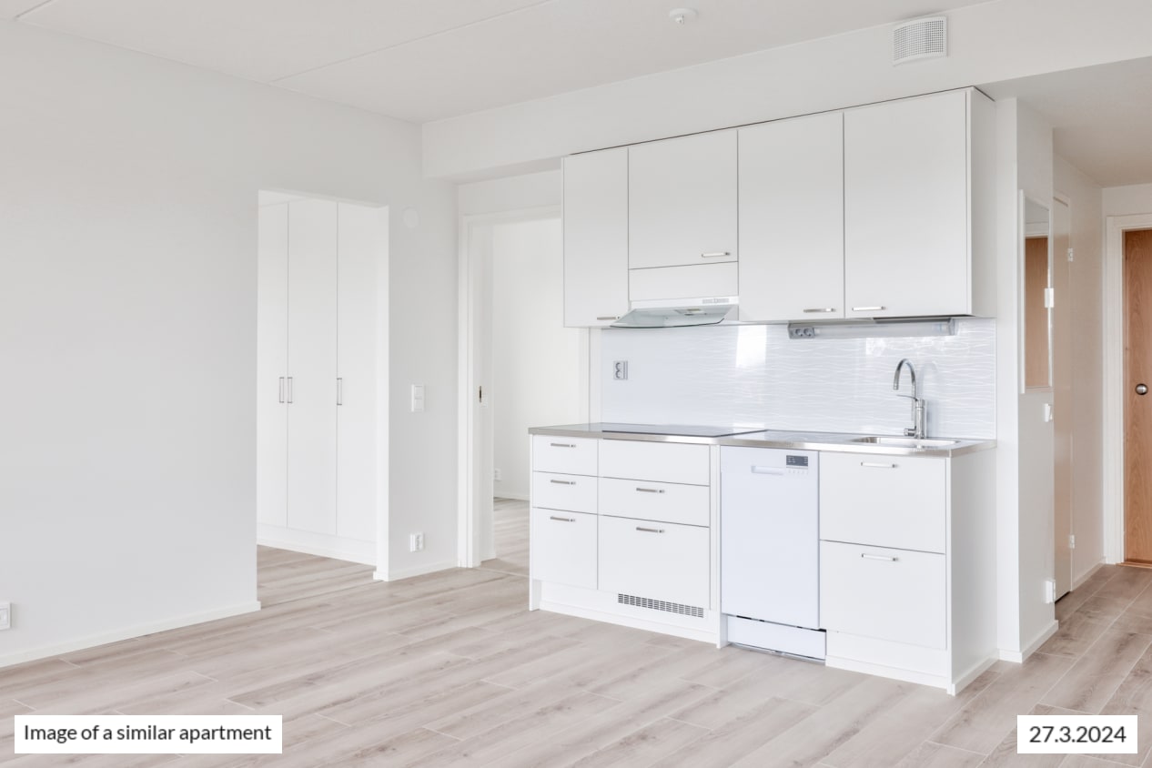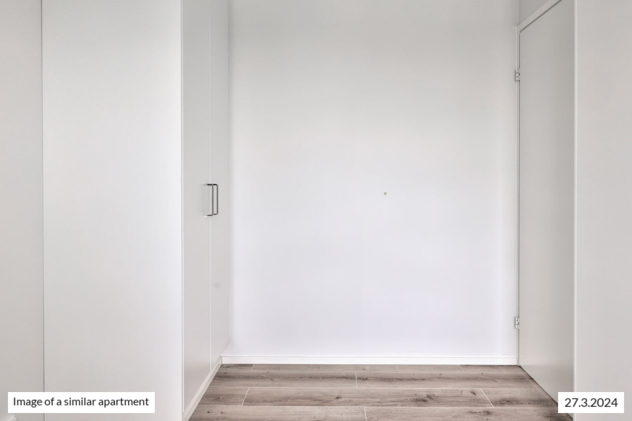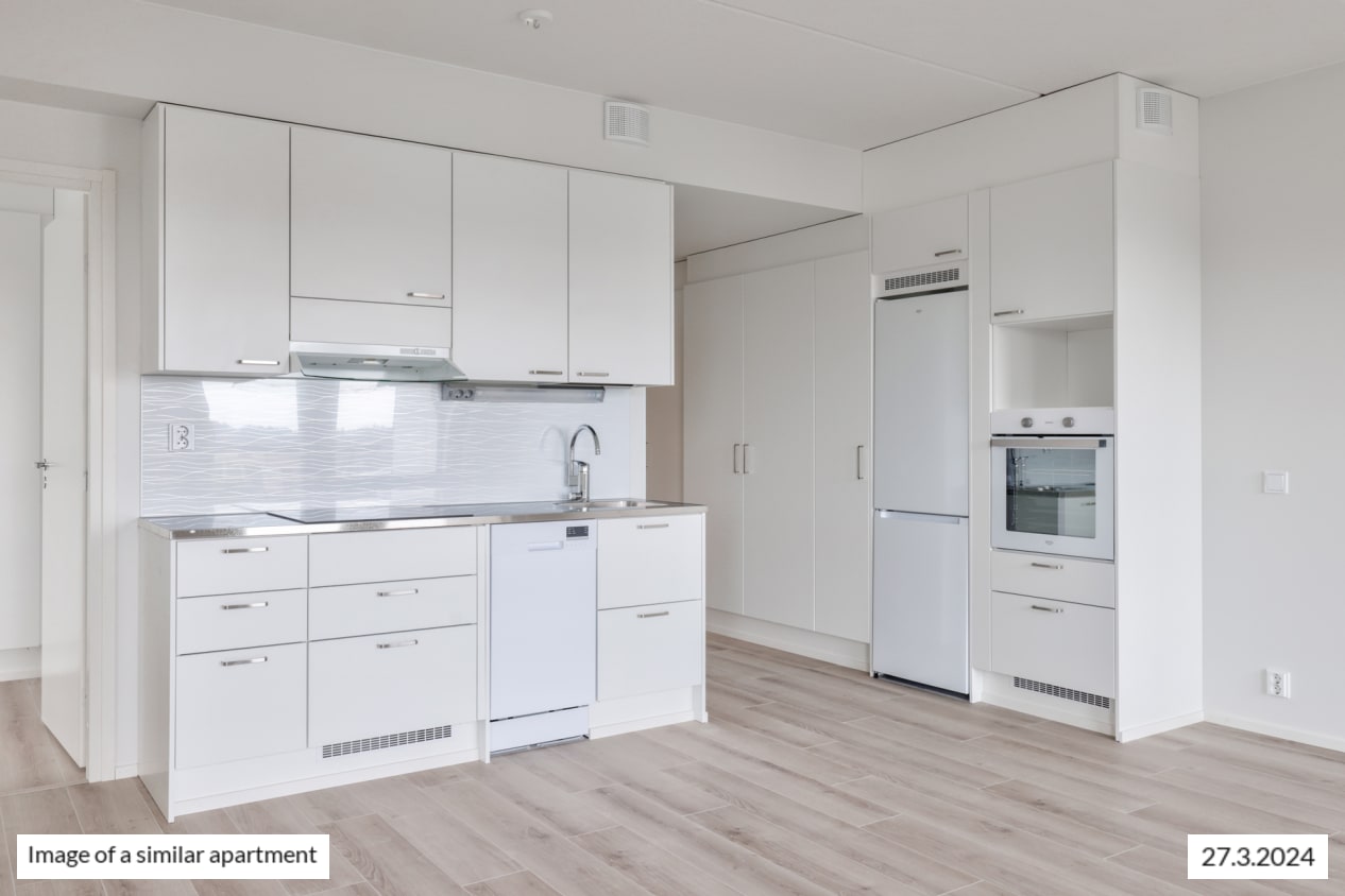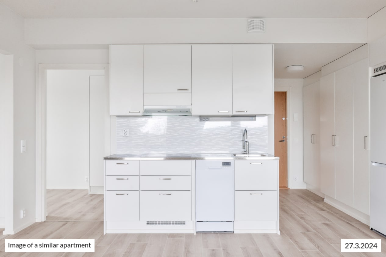 The home's light surface materials offer a neutral base for your own, personal style. The floors are light oak-shaded laminate, and the walls are painted white. The windows have blinds. The kitchens have white cabinets, the space between the upper and lower cabinets is light furniture board, and the countertops are made of light laminate or stainless steel. The fully equipped kitchen has an induction hob, built-in oven, extractor hood, dishwasher, and fridge-freezer. There is also room for a microwave oven. Cooking in this kitchen for family and friends is a joy.