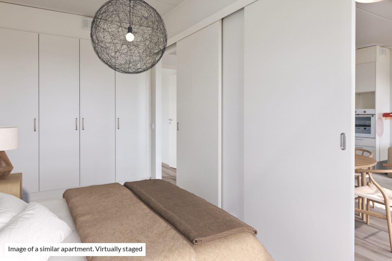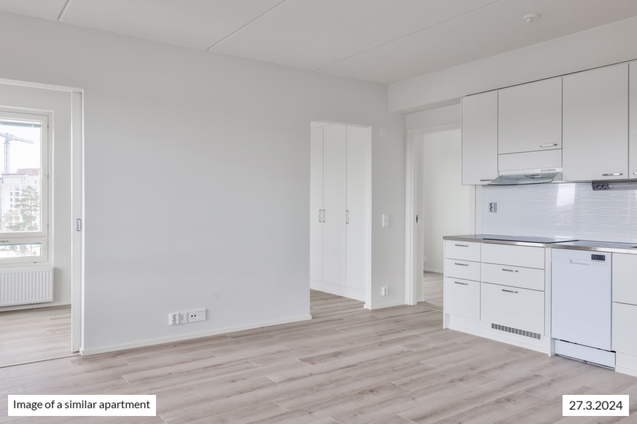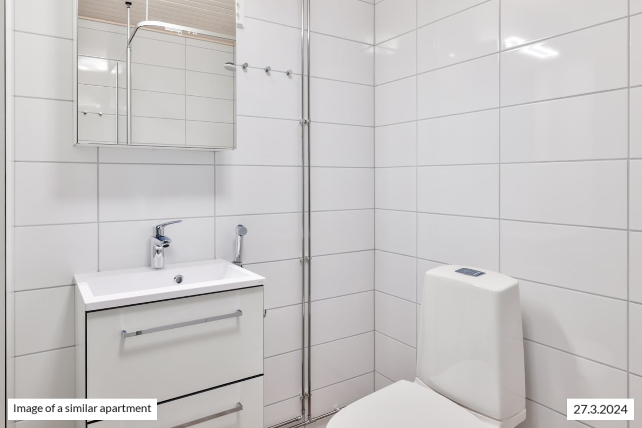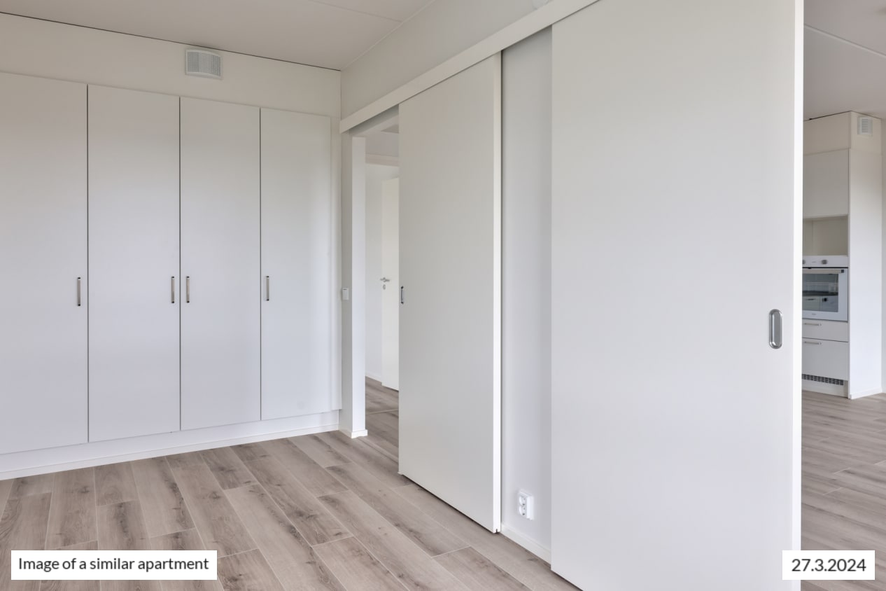 The home's light surface materials offer a neutral base for your own, personal style. The floors are light oak-shaded laminate, and the walls are painted white. The windows have blinds. The kitchens have white cabinets, the space between the upper and lower cabinets is light furniture board, and the countertops are made of light laminate or stainless steel. The fully equipped kitchen has an induction hob, built-in oven, extractor hood, dishwasher, and fridge-freezer. There is also room for a microwave oven. Cooking in this kitchen for family and friends is a joy.