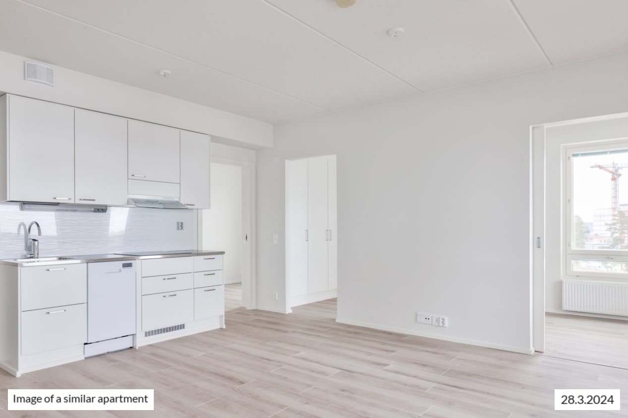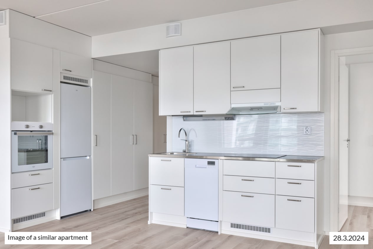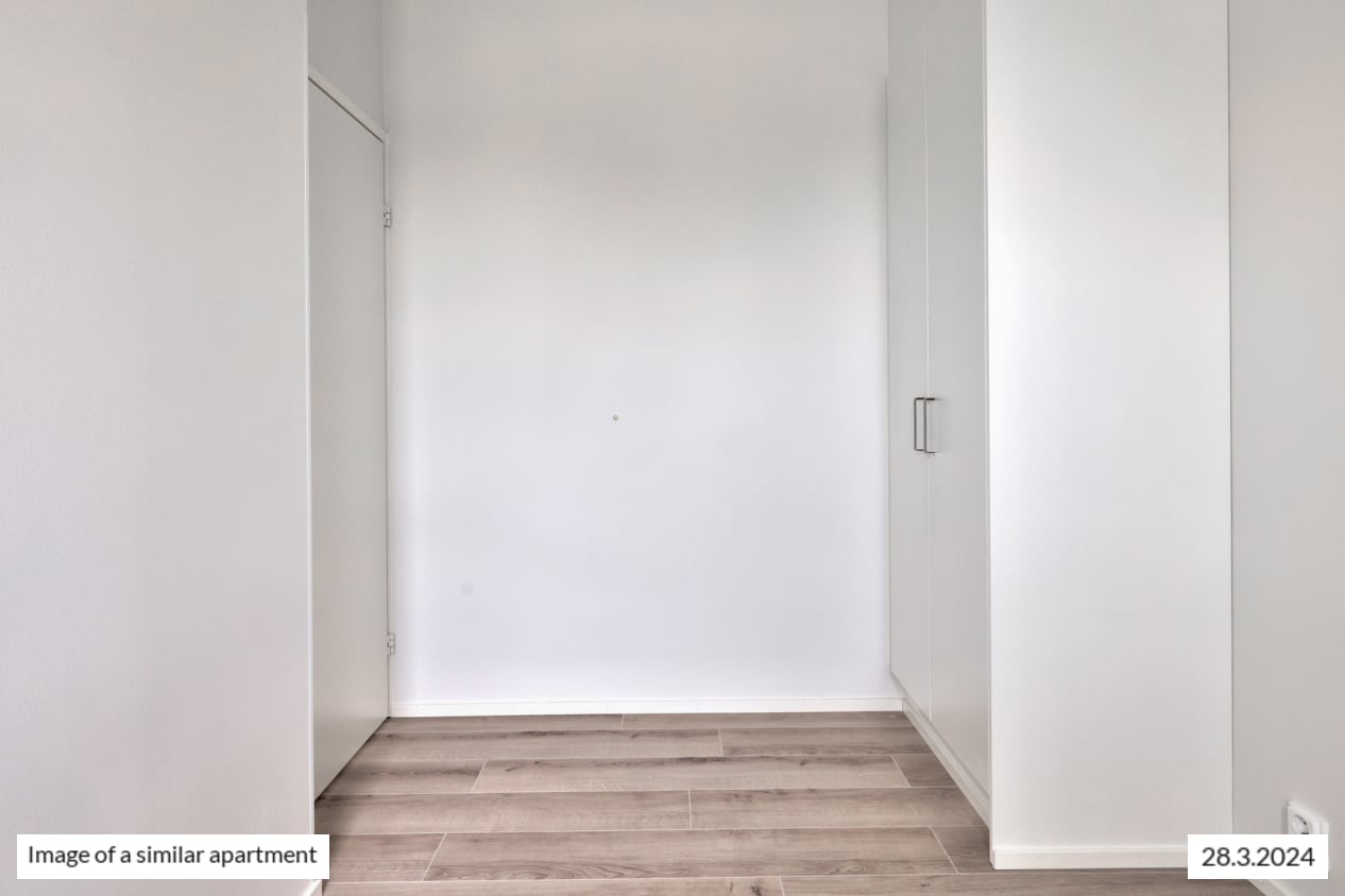 The bright corner apartment has windows in two different directions, a functional layout, ample cupboard space, and a practical kitchen-living room. During the summer months, you can extend the living area onto the roomy glazed balcony, offering views towards the west.