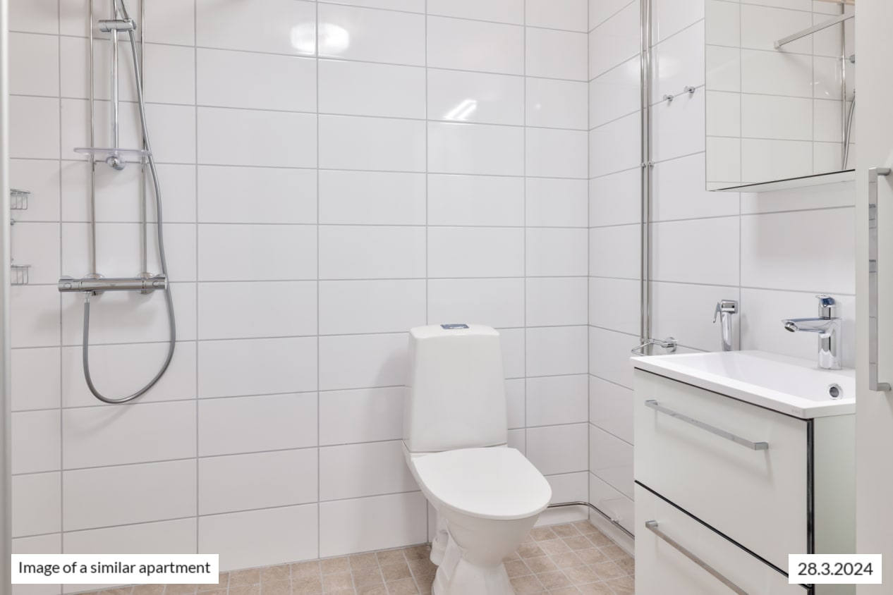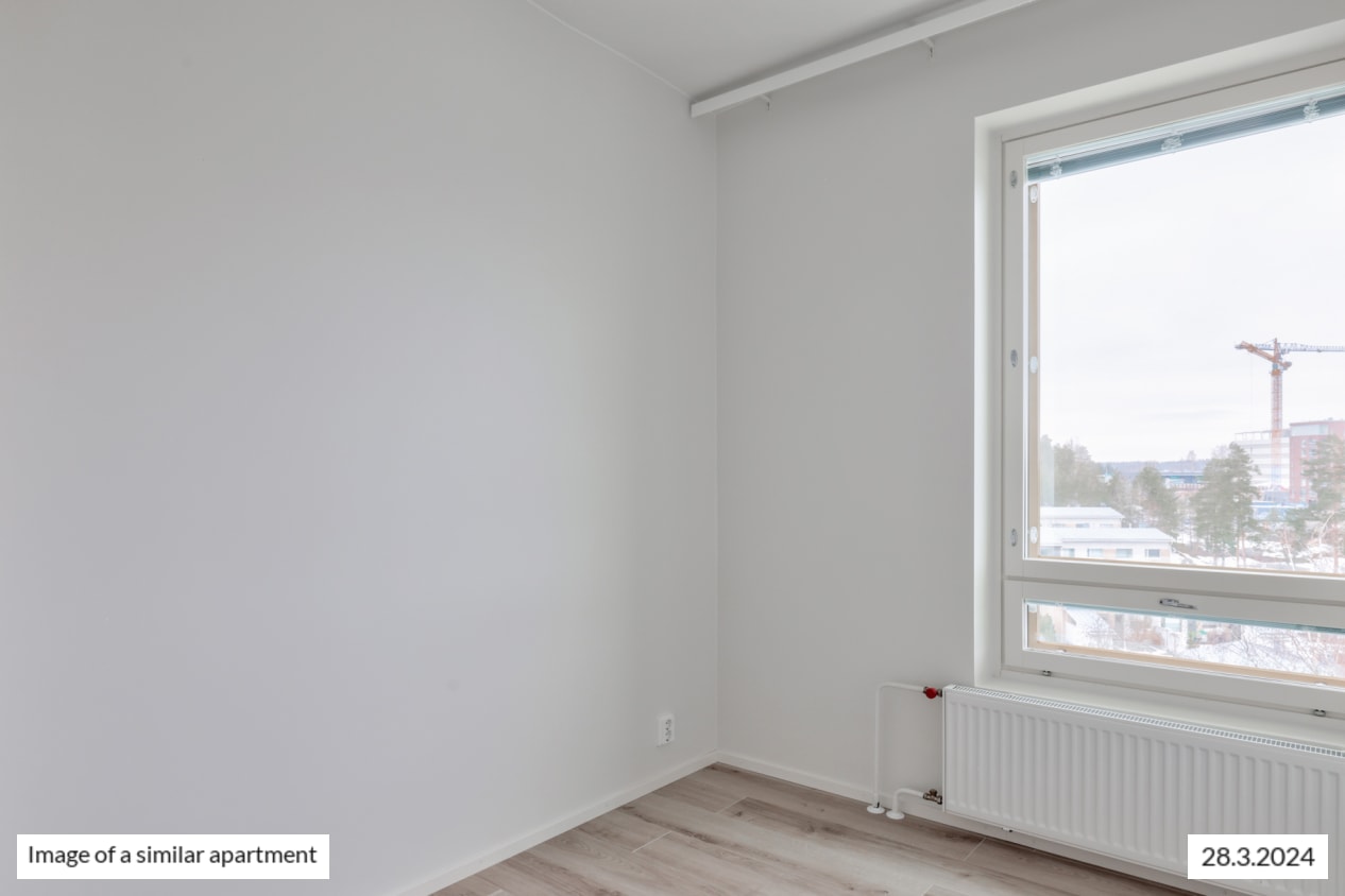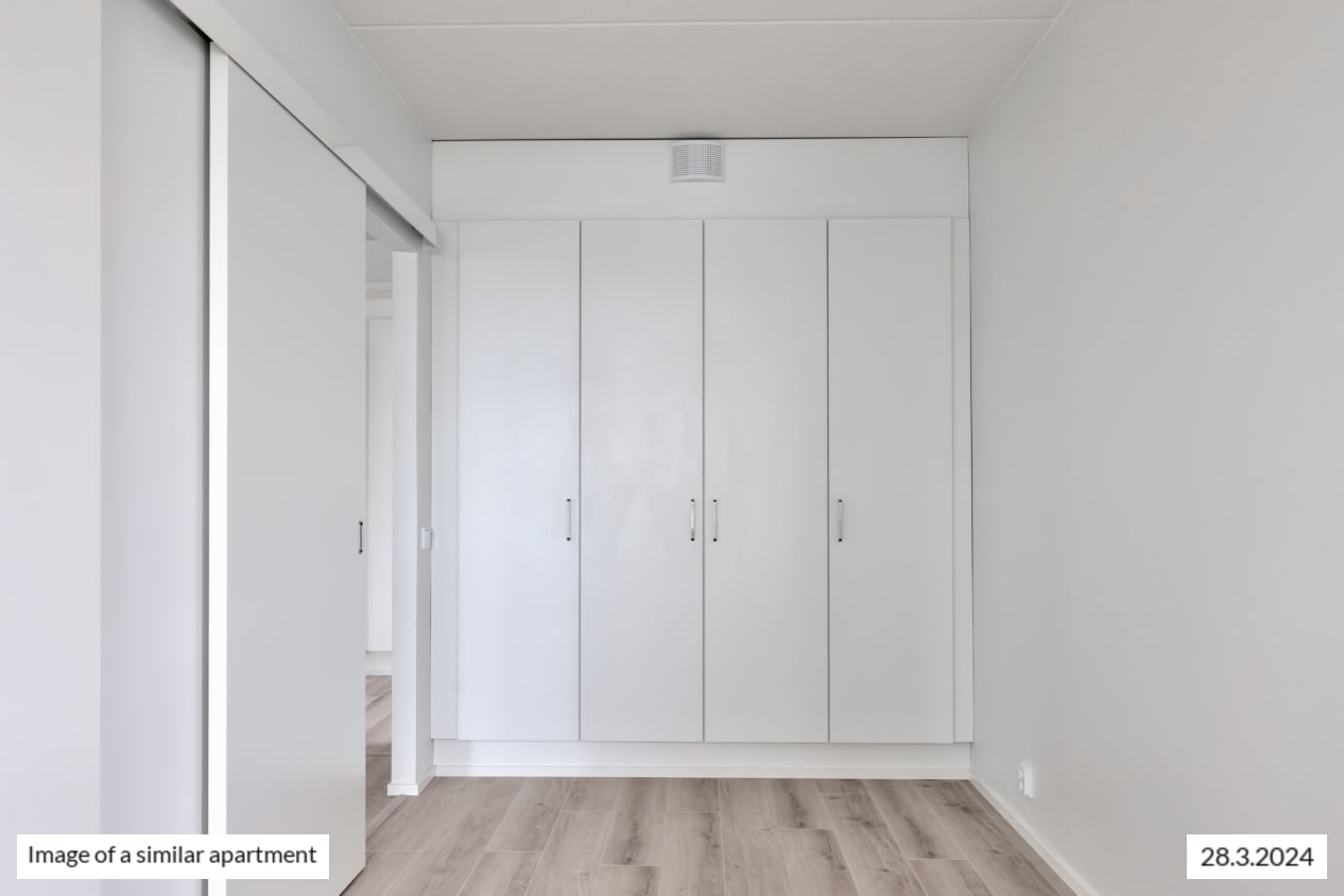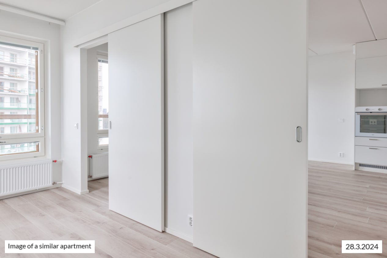The bright corner apartment has windows in two different directions, a functional layout, ample cupboard space, and a practical kitchen-living room. During the summer months, you can extend the living area onto the roomy glazed balcony, offering views towards the west.