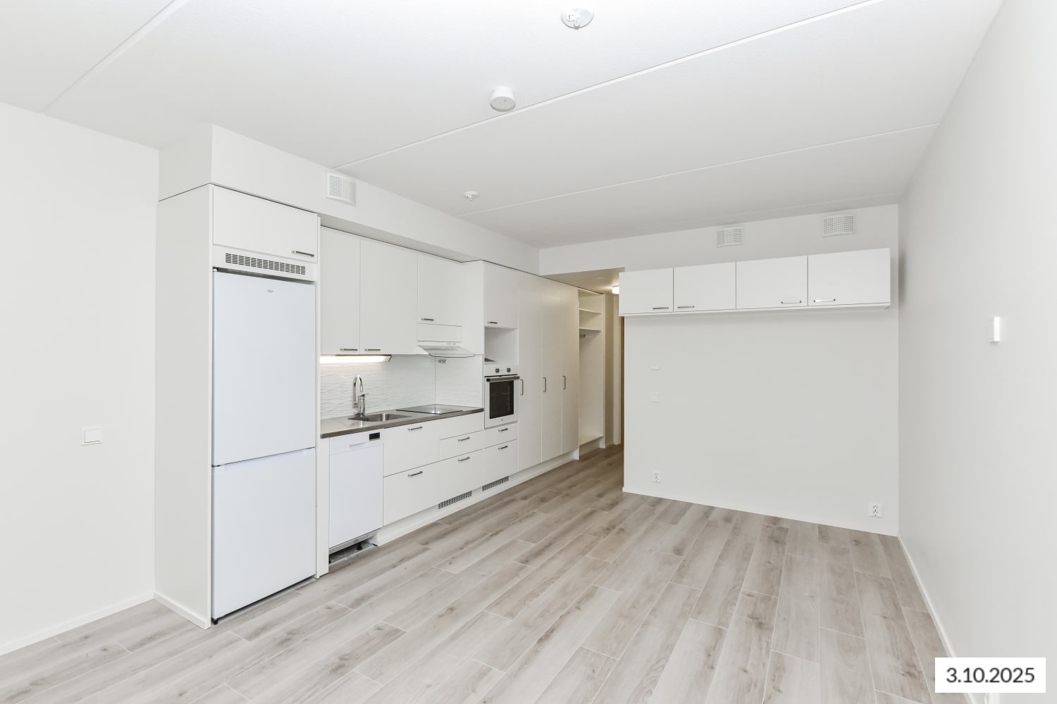 The floors of the living rooms are made of light oak-coloured laminate, and the walls are painted white. The windows have light-coloured venetian blinds and double-track curtain rails. All homes have a glazed balcony and a provision for your own air source heat pump on the balcony. The kitchen cabinets are white laminate, and the worktop is textured steel with a lively surface. The backsplash is protected with a white panel. Kitchens are equipped with either a 50 or 60 cm wide induction hob, a fridge-freezer or separate fridge and freezer, and a 45 or 60 cm wide dishwasher. The appliances are white. The cabinets also have a designated space for a microwave. The bathroom features SATO Kide range white solid laminate furniture made in Finland, as well as a shower wall and/or shower curtain. The wet room walls have large, white ceramic tiles, with smaller grey tiles on the floors. The saunas are wood-panelled. The bathroom has space for your own washing machine and tumble dryer. The tile floors in the bathrooms and saunas have underfloor heating.