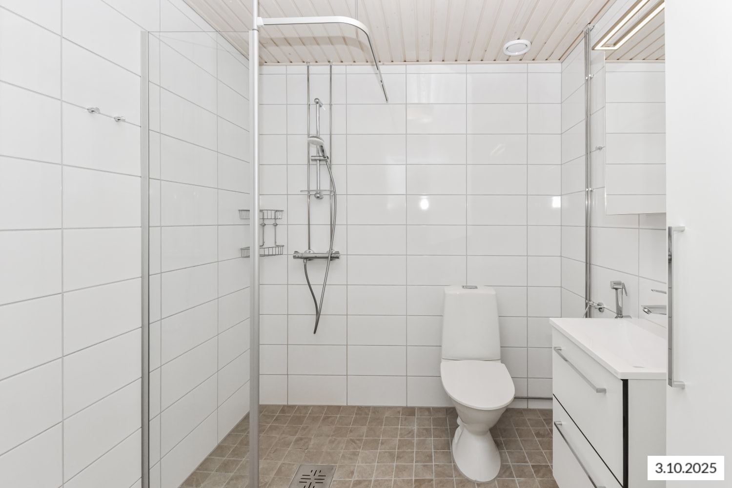 A sure boost to everyday life is the brand-new home spa, walls of which are white and floor in grey tile. The efficient bathroom also has space reserved for a washing machine and tumble dryer. Laundry sorting and storage are conveniently handled thanks to the laundry cabinet.