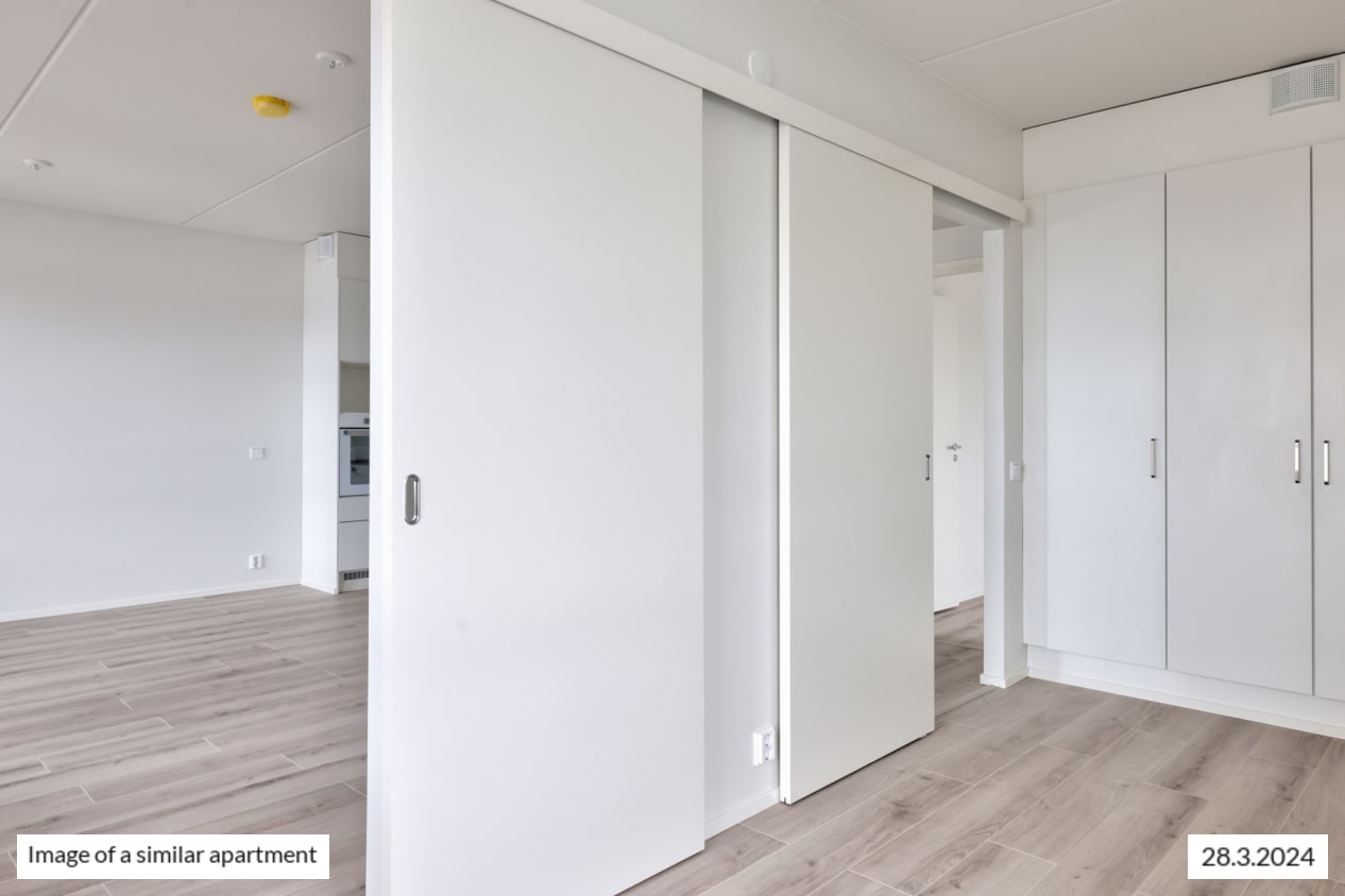 The floors of the living rooms are made of light oak-coloured laminate, and the walls are painted white. The windows have light-coloured venetian blinds and double-track curtain rails. All homes have a glazed balcony and a provision for your own air source heat pump on the balcony. The kitchen cabinets are white laminate, and the worktop is textured steel with a lively surface. The backsplash is protected with a white panel. Kitchens are equipped with either a 50 or 60 cm wide induction hob, a fridge-freezer or separate fridge and freezer, and a 45 or 60 cm wide dishwasher. The appliances are white. The cabinets also have a designated space for a microwave. The bathroom features SATO Kide range white solid laminate furniture made in Finland, as well as a shower wall and/or shower curtain. The wet room walls have large, white ceramic tiles, with smaller grey tiles on the floors. The saunas are wood-panelled. The bathroom has space for your own washing machine and tumble dryer. The tile floors in the bathrooms and saunas have underfloor heating.
