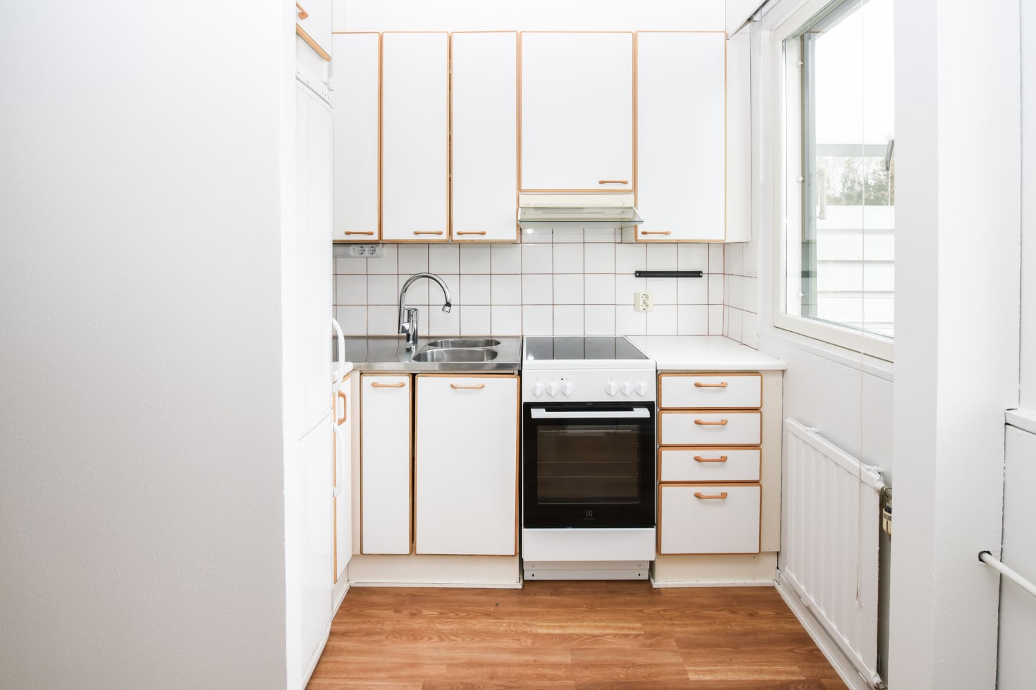 The kitchen's white cabinets have wooden edging. The space between the cabinets is tiled with white tiles. The kitchen is equipped with a ceramic stove, dishwasher, and freezer-refrigerator.