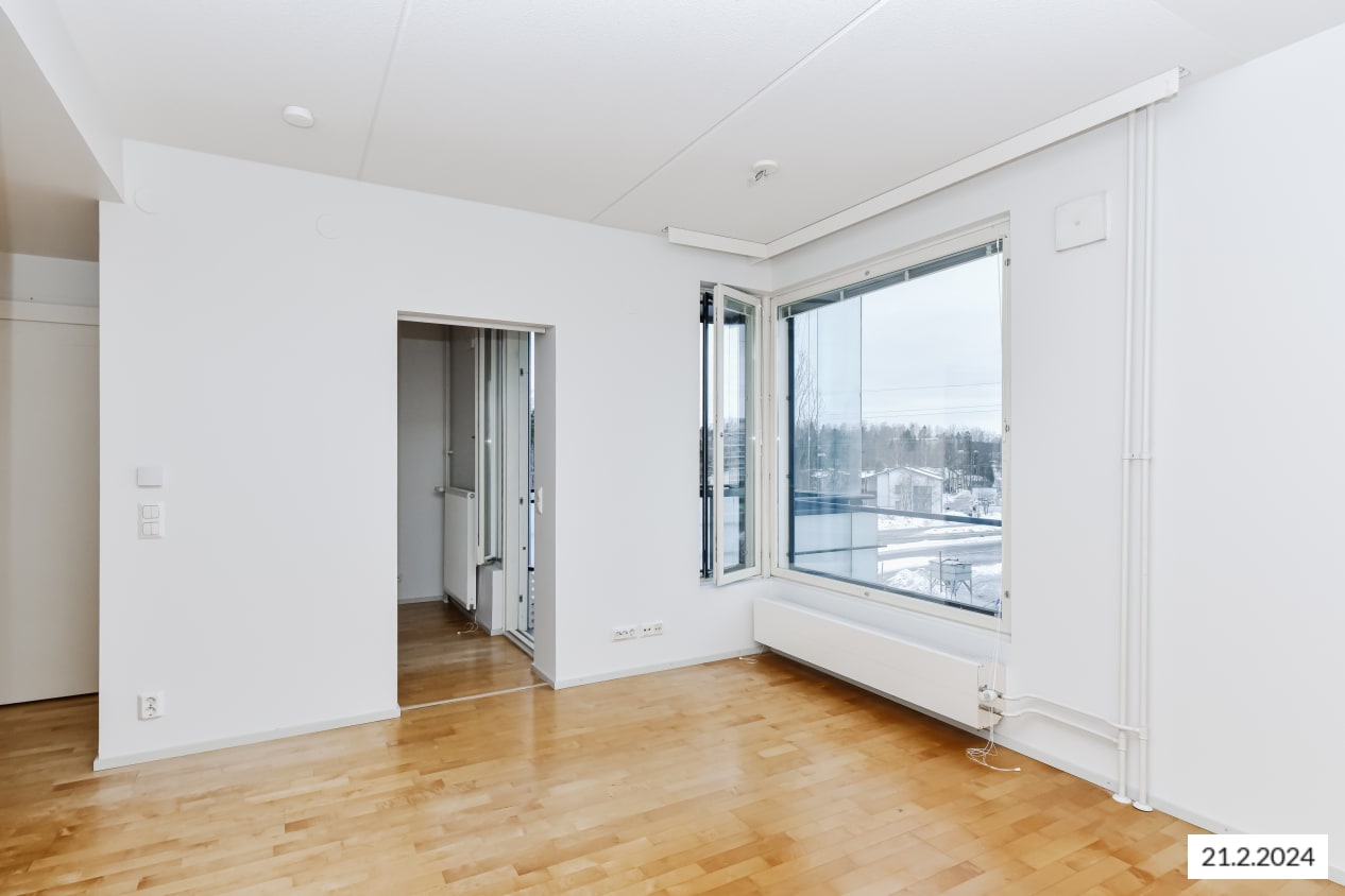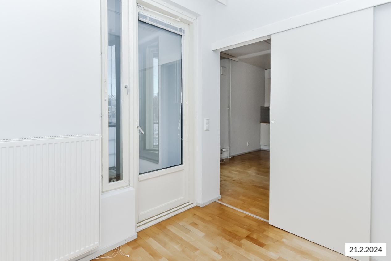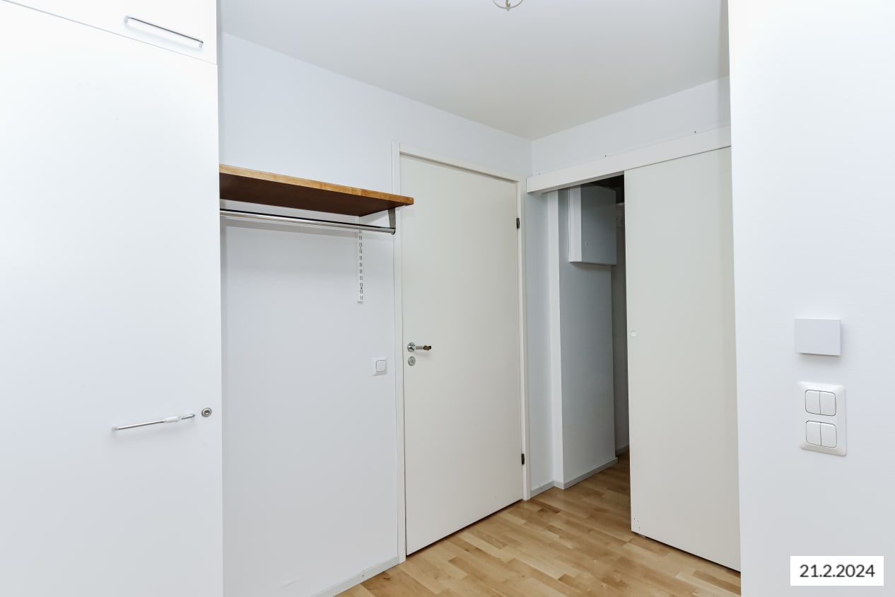 It's easy to create a home in this bright studio apartment. The balcony provides extra space and could be perfect for a summer container garden. The alcove can be furnished as a cosy sleeping corner or even a workspace. There's a handy walk-in wardrobe connected to the hallway.