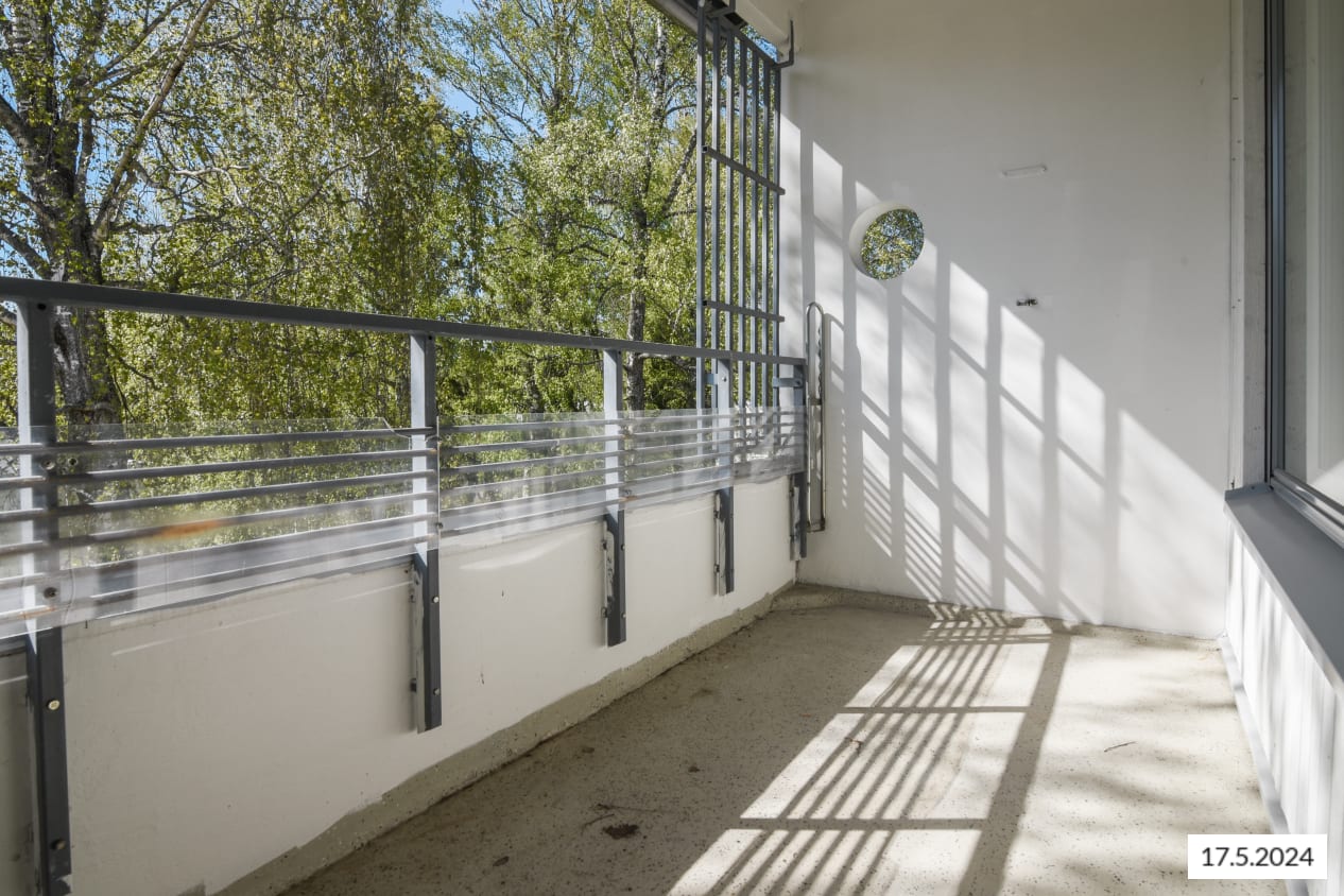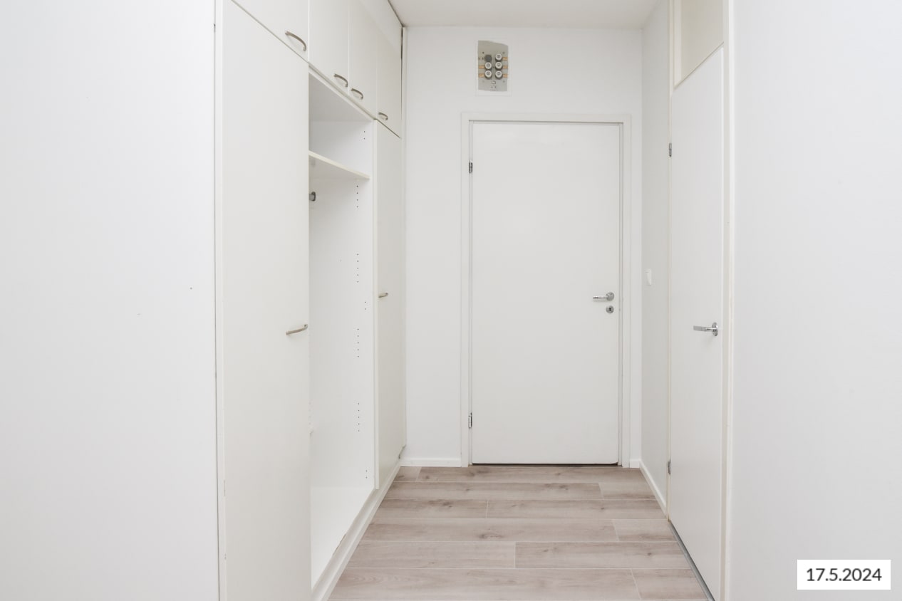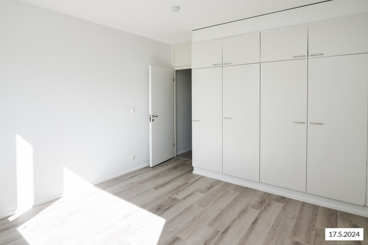 This spacious three-bedroom family home features a traditionally functional layout: the living room opens onto a glazed balcony with leafy views of the inner courtyard. There’s plenty of storage throughout, including both cabinets and a handy walk-in closet in the entrance hall, plus additional wardrobes in all bedrooms.