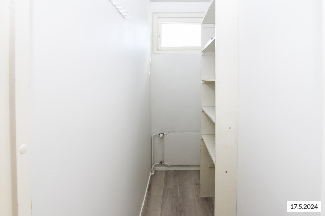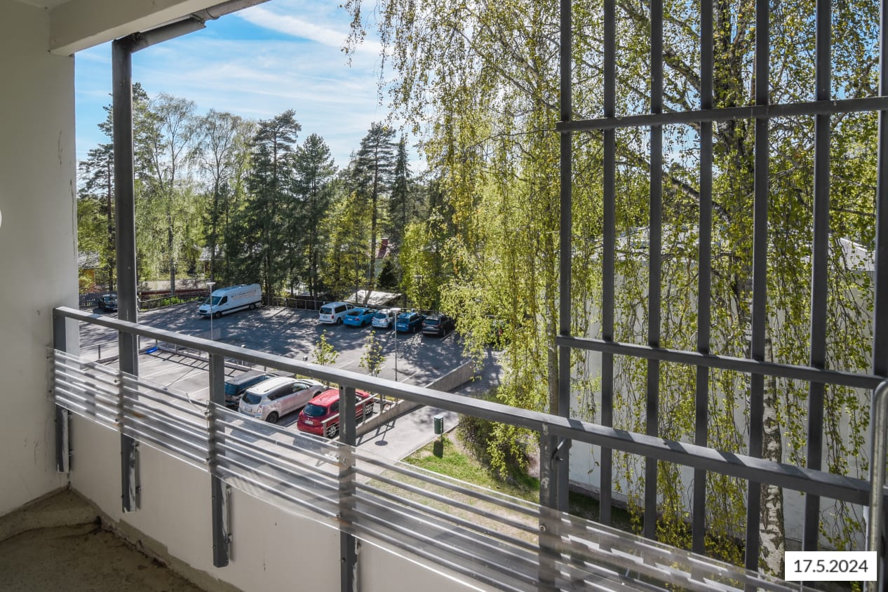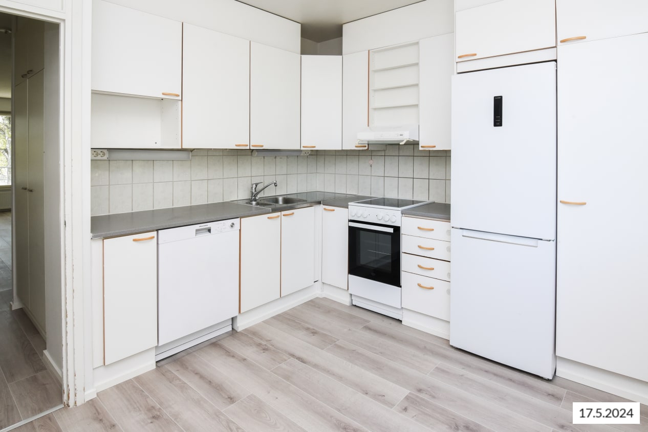 This spacious three-bedroom family home features a traditionally functional layout: the living room opens onto a glazed balcony with leafy views of the inner courtyard. There’s plenty of storage throughout, including both cabinets and a handy walk-in closet in the entrance hall, plus additional wardrobes in all bedrooms.