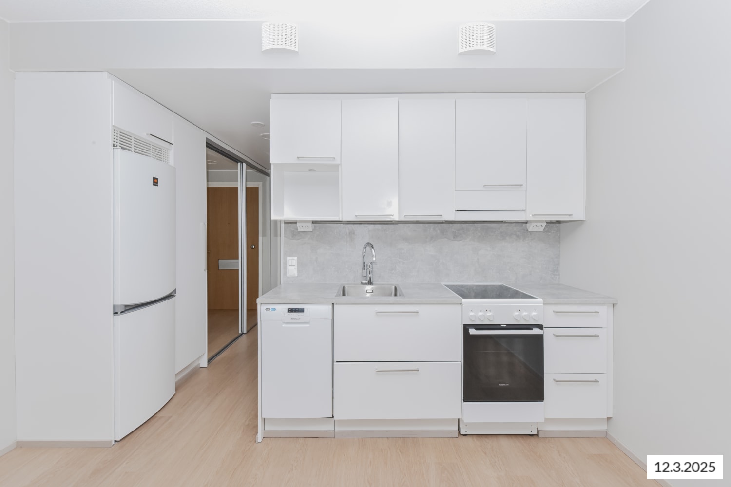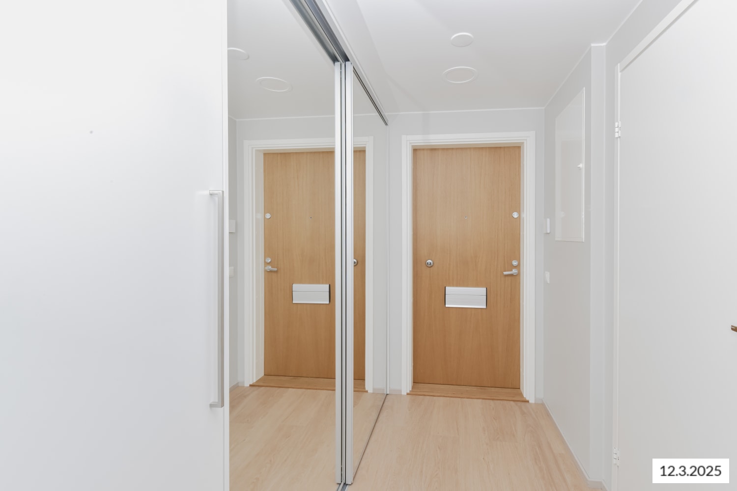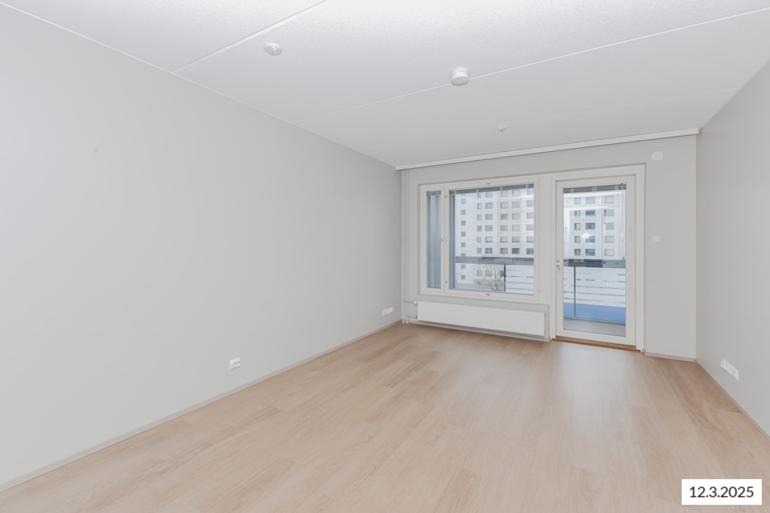 This brand-new studio feels more spacious than its square metres suggest and is easy to furnish into a cosy home. A small dining table fits neatly next to the kitchen area, and the generously sized glazed balcony faces the evening sun. The entrance features a mirrored wardrobe, and the window comes with ready-installed Venetian blinds.