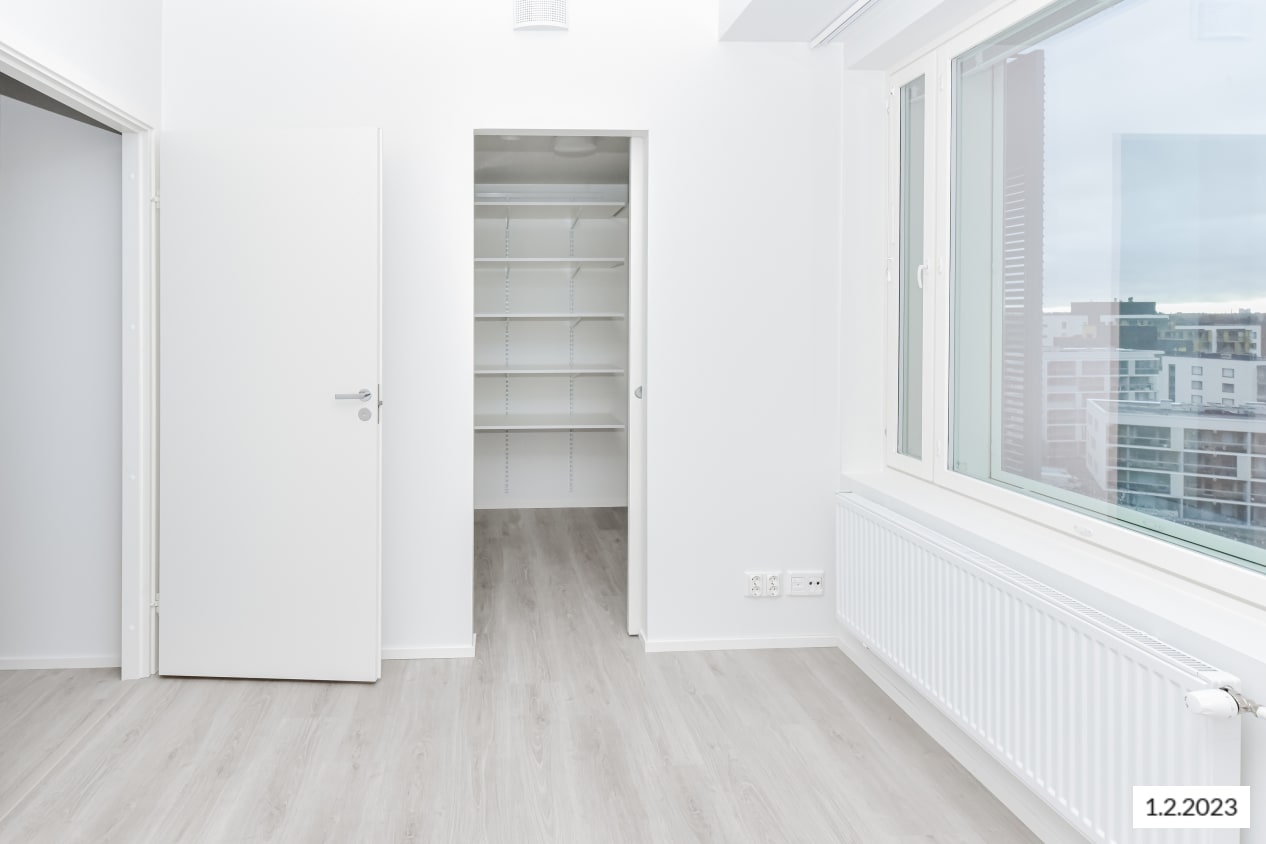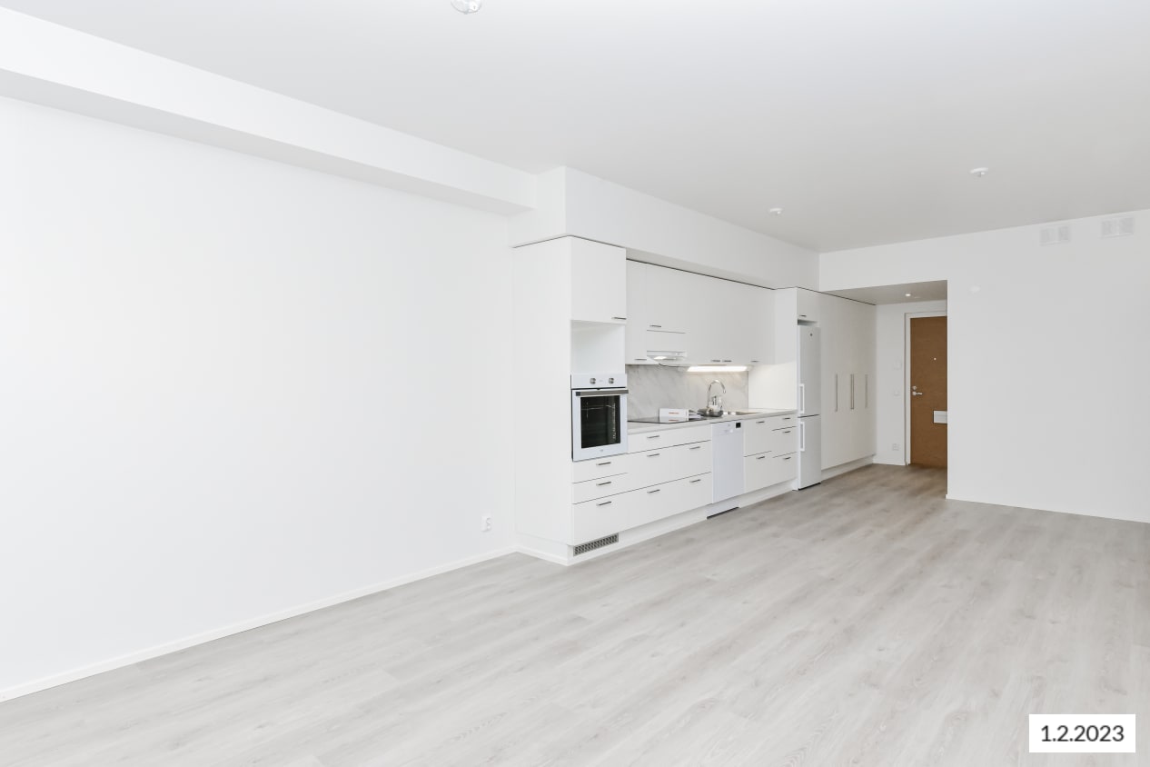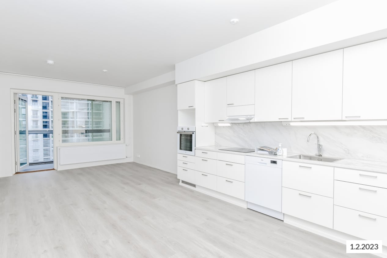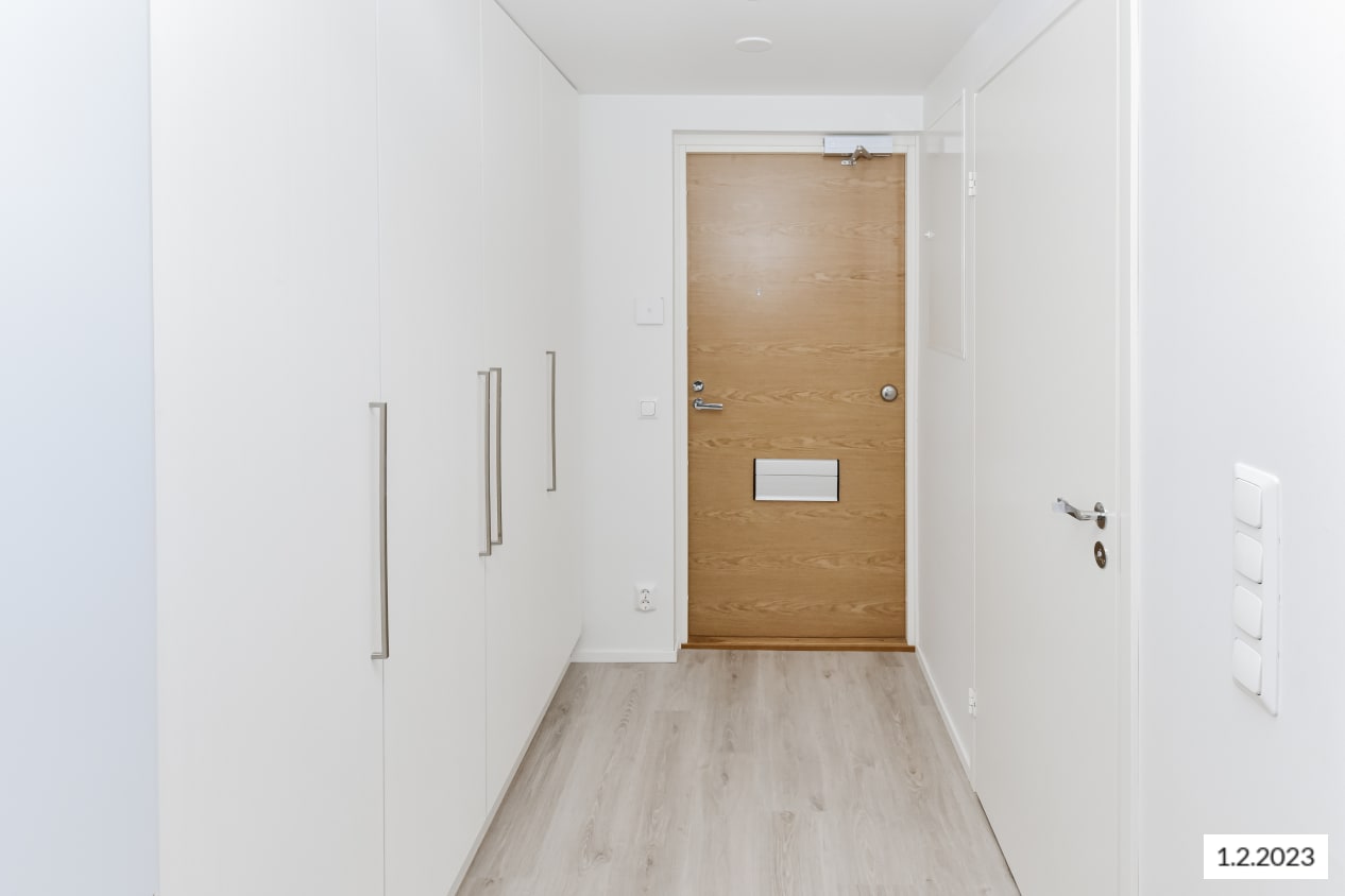 The light-filled two-bedroom home has a smart layout with plenty of potential ways to furnish the space just the way you like it. This totally new apartment is extended by a glassed-in balcony with a view towards the sea and the courtyard. The home’s surface materials are timelessly beautiful, and the light colour scheme provides a neutral backdrop for any decor style. There are several wardrobes in the entrance hallway and larger bedroom, and additional storage space is provided by the walk-in closet accessed from the smaller bedroom. You can also fit a workspace in both bedrooms. The open-plan kitchen has fresh white cabinet doors and marble-look laminate worktops as well as plenty of space for a dining table. The kitchen is equipped with a ceramic cooktop, built-in oven, dishwasher, cold appliances and space for a microwave. The bathroom comes with white Kide range furniture designed for SATO and made in Finland. The bathroom walls are done in white tiles, and the floor tiles are dark grey. The bathroom has space for a washing machine and dryer. Maybe this could be your new RentHome?