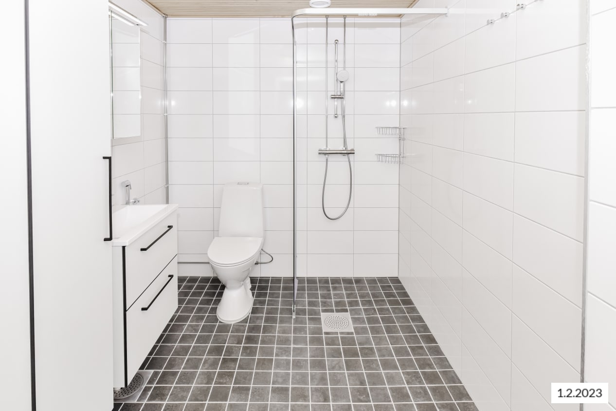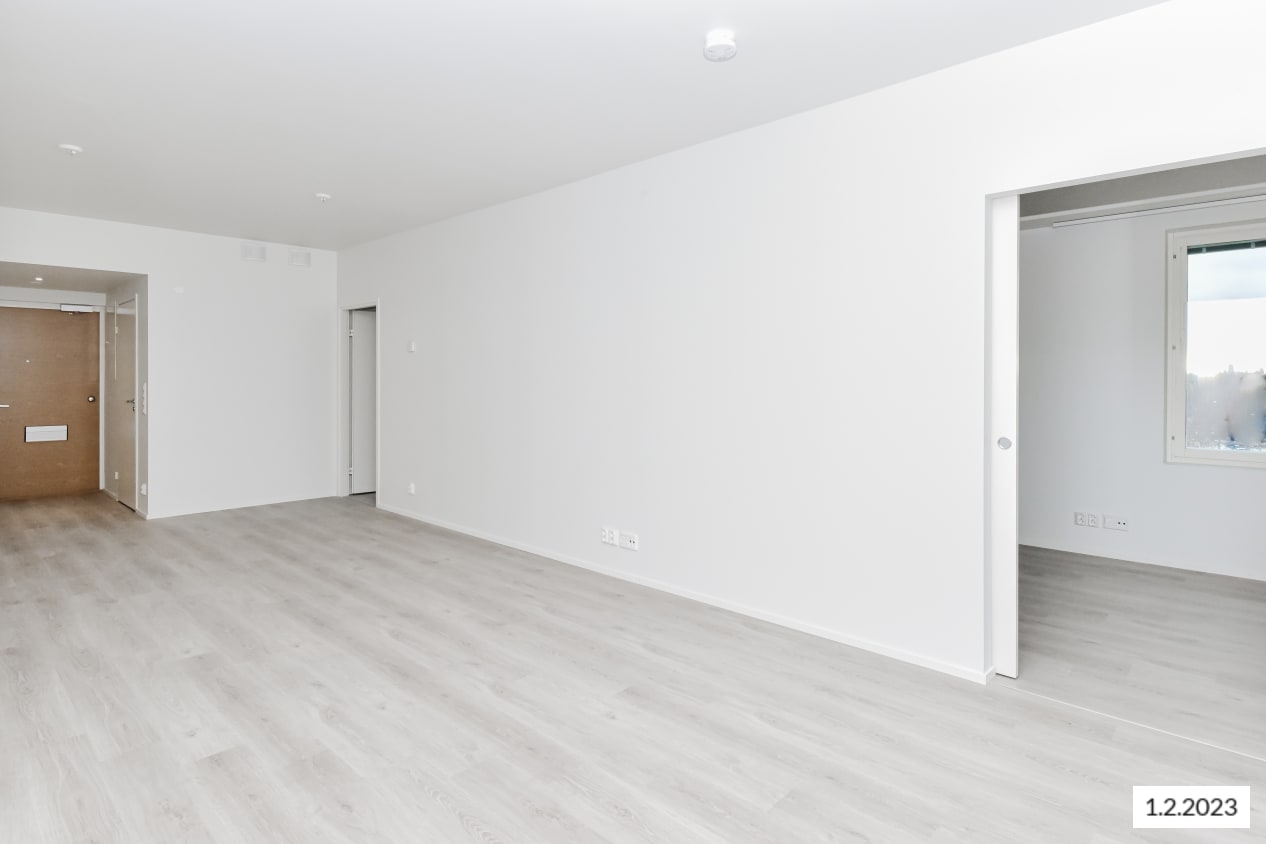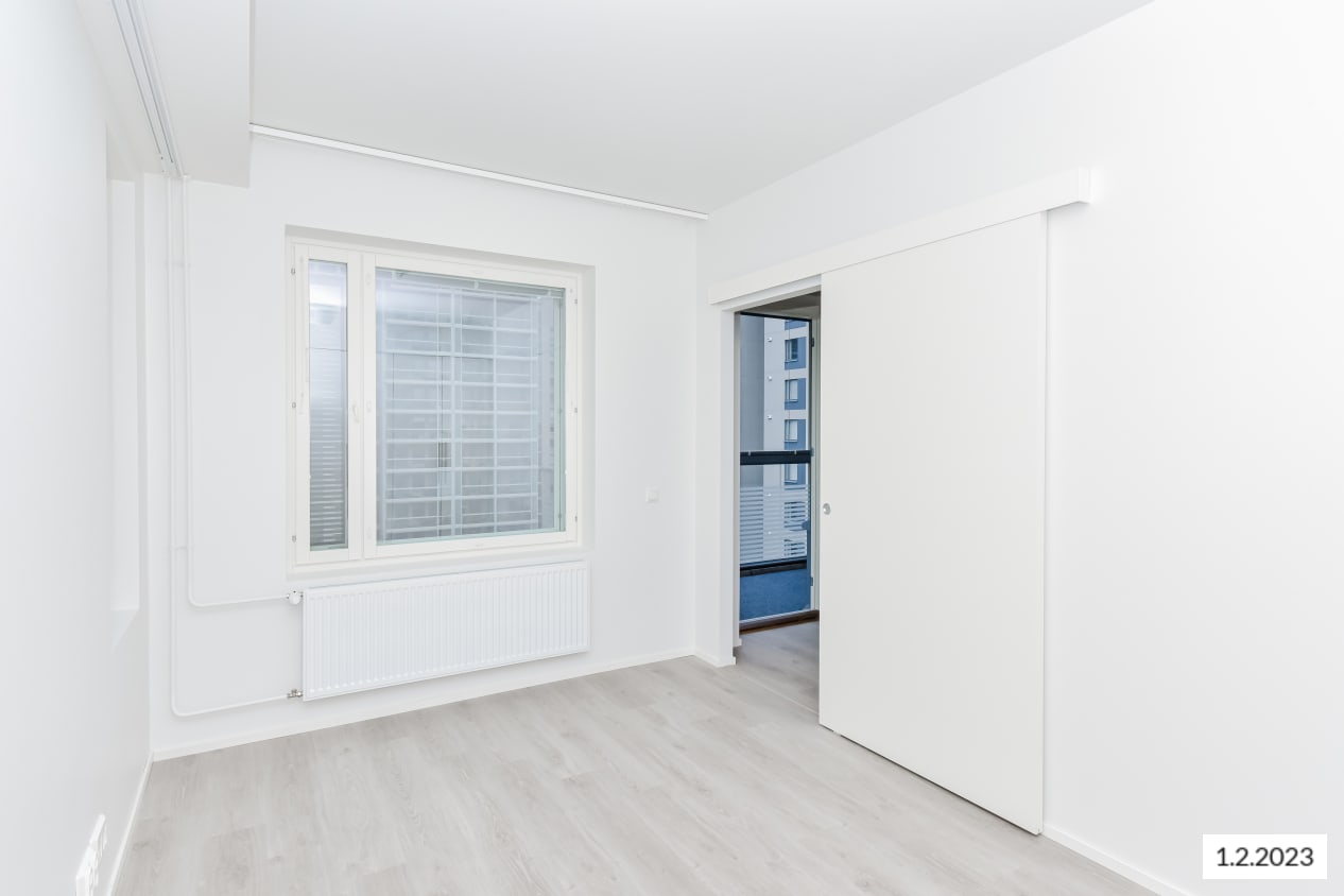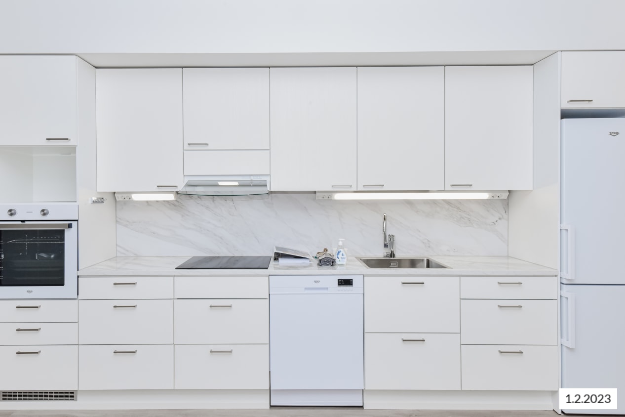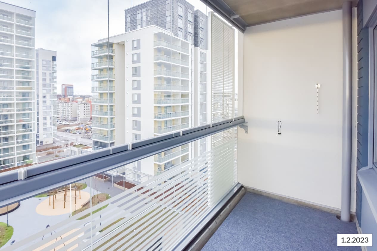 The light-filled two-bedroom home has a smart layout with plenty of potential ways to furnish the space just the way you like it. This totally new apartment is extended by a glassed-in balcony with a view towards the sea and the courtyard. The home’s surface materials are timelessly beautiful, and the light colour scheme provides a neutral backdrop for any decor style. There are several wardrobes in the entrance hallway and larger bedroom, and additional storage space is provided by the walk-in closet accessed from the smaller bedroom. You can also fit a workspace in both bedrooms. The open-plan kitchen has fresh white cabinet doors and marble-look laminate worktops as well as plenty of space for a dining table. The kitchen is equipped with a ceramic cooktop, built-in oven, dishwasher, cold appliances and space for a microwave. The bathroom comes with white Kide range furniture designed for SATO and made in Finland. The bathroom walls are done in white tiles, and the floor tiles are dark grey. The bathroom has space for a washing machine and dryer. Maybe this could be your new RentHome?
