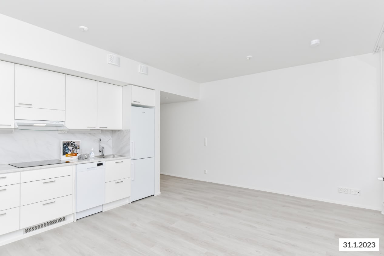 The light-filled one-bedroom home has a smart layout with plenty of potential ways to furnish the space just the way you like it. This totally new apartment is extended by a large glassed-in balcony overlooking the courtyard and the nearby basketball court. The home’s surface materials are timelessly beautiful, and the light colour scheme provides a neutral backdrop for any decor style. There are several wardrobes in the entrance hallway, and additional storage space is provided by the walk-in closet accessed from the bedroom. The open-plan kitchen has fresh white cabinet doors and marble-look laminate worktops as well as plenty of space for a dining table. The kitchen is equipped with a ceramic cooktop, built-in oven, dishwasher, cold appliances and space for a microwave. The bathroom comes with white Kide range furniture designed for SATO and made in Finland. The bathroom walls are done in white tiles, and the floor tiles are dark grey. The bathroom has space for a washing machine and dryer. Maybe this could be your new RentHome?
