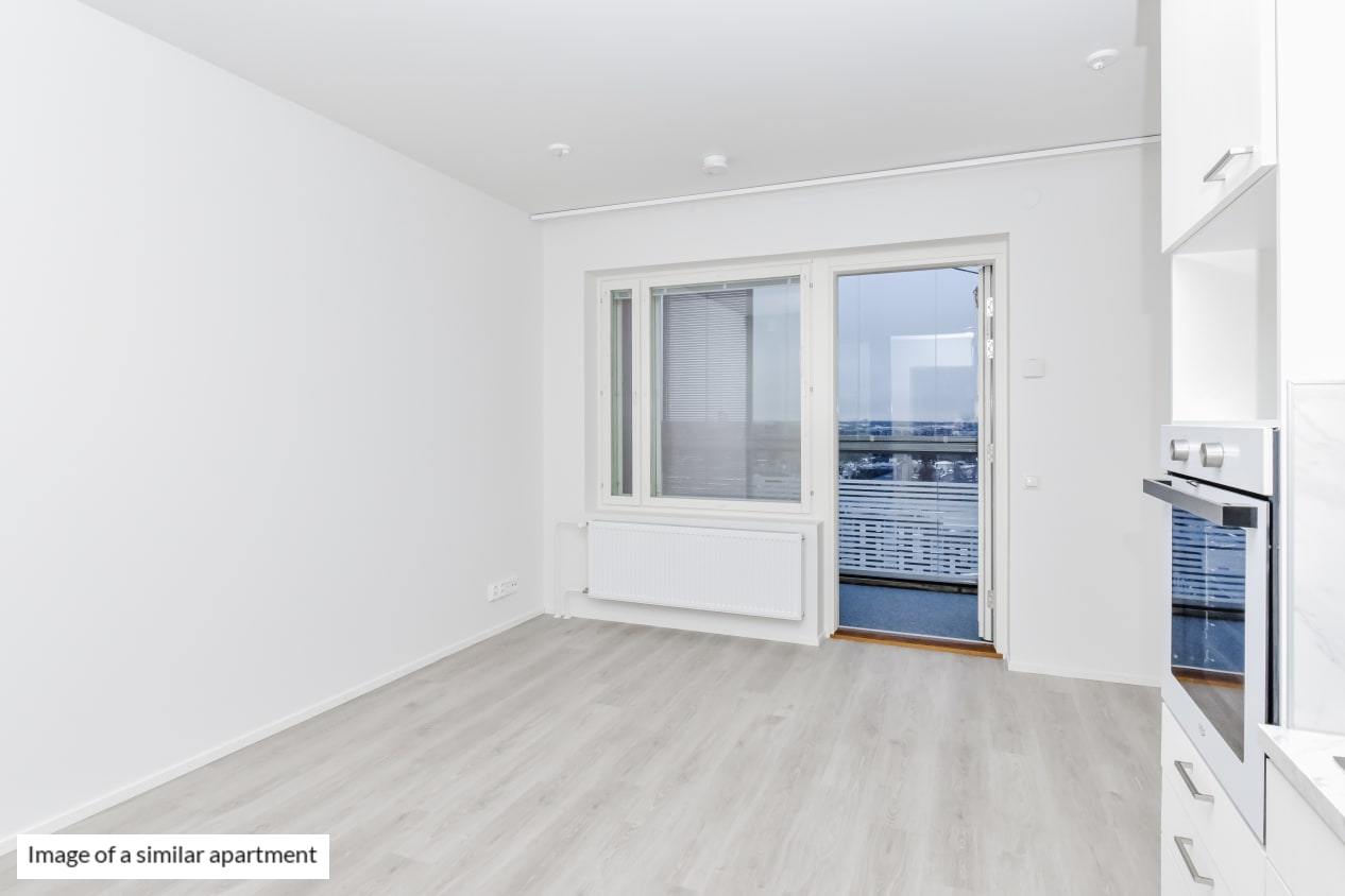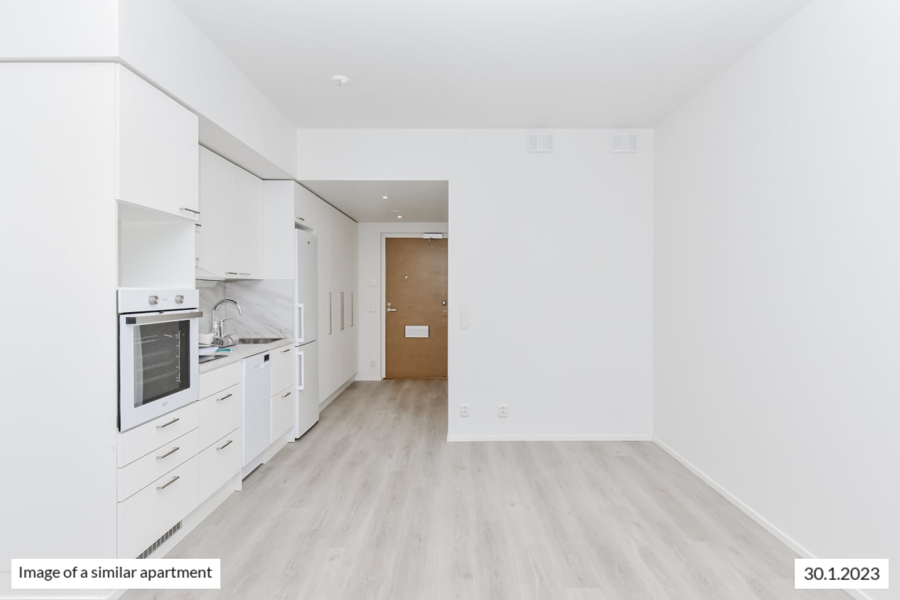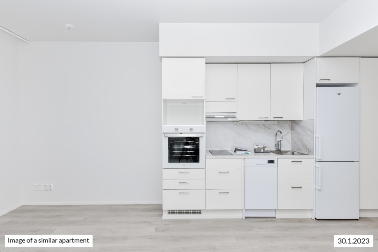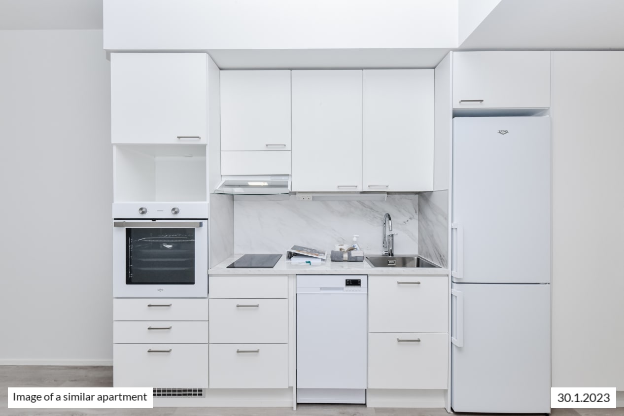 The light-filled home on the second-highest floor has a smart layout with plenty of potential ways to furnish the space just the way you like it. This totally new apartment is extended by a glassed-in balcony spanning the entire width of the space and with a view towards the sea in the direction of Helsinki and Vermo harness racing track. This home makes use of every square metre. The compact studio has a functional open-plan kitchen and wardrobe space in the entrance hallway. The home’s surface materials are timelessly beautiful, and the light colour scheme provides a neutral backdrop for any decor style. The open-plan kitchen has fresh white cabinet doors and marble-look laminate worktops. The kitchen is equipped with a ceramic cooktop, built-in oven, dishwasher, cold appliances and space for a microwave. The bathroom comes with white Kide range furniture designed for SATO and made in Finland. The bathroom walls are done in white tiles, and the floor tiles are dark grey. The bathroom has space for a washing machine and dryer. Maybe this could be your new RentHome?