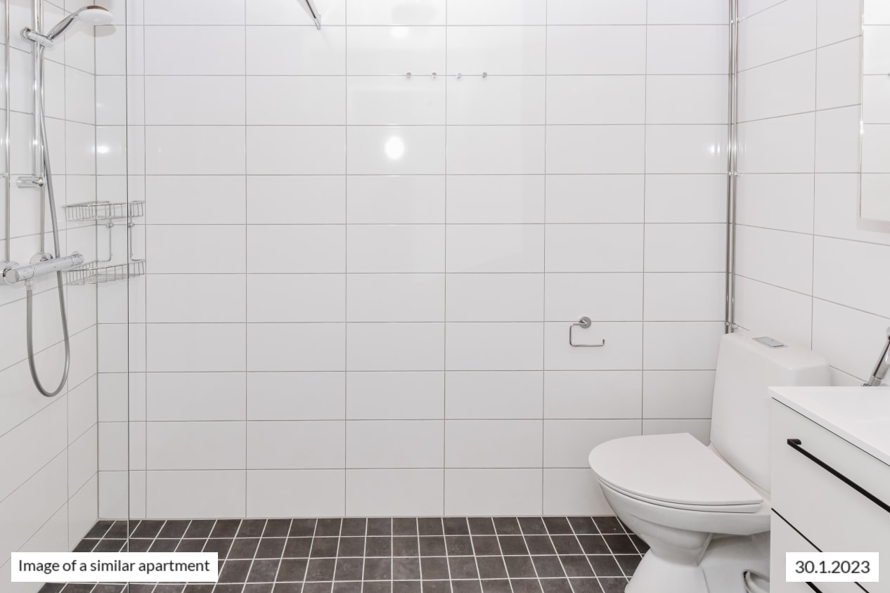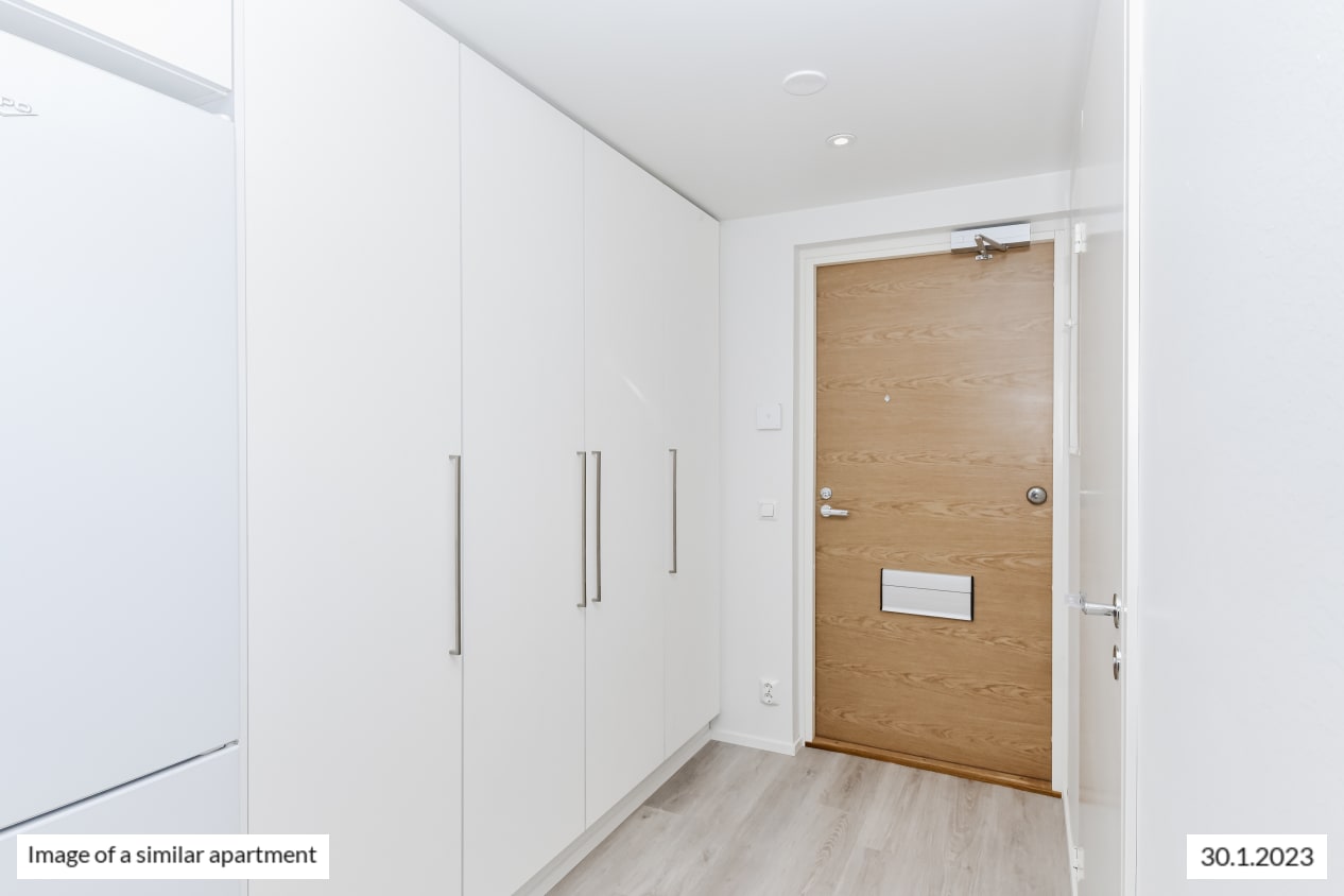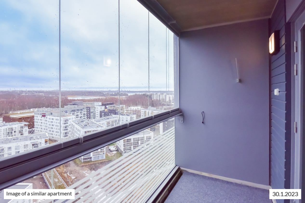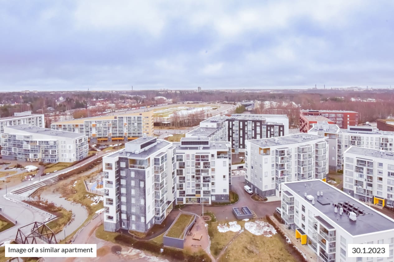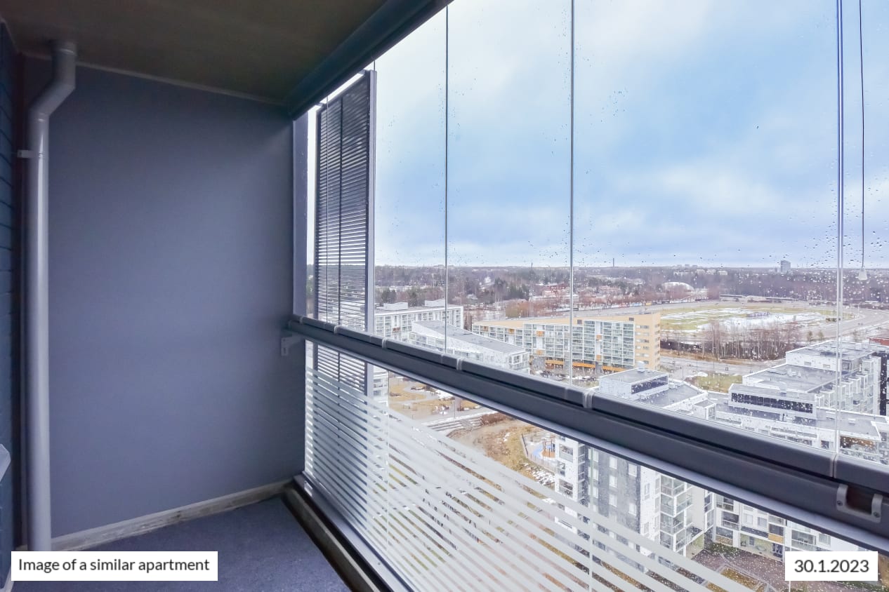 The light-filled home on the second-highest floor has a smart layout with plenty of potential ways to furnish the space just the way you like it. This totally new apartment is extended by a glassed-in balcony spanning the entire width of the space and with a view towards the sea in the direction of Helsinki and Vermo harness racing track. This home makes use of every square metre. The compact studio has a functional open-plan kitchen and wardrobe space in the entrance hallway. The home’s surface materials are timelessly beautiful, and the light colour scheme provides a neutral backdrop for any decor style. The open-plan kitchen has fresh white cabinet doors and marble-look laminate worktops. The kitchen is equipped with a ceramic cooktop, built-in oven, dishwasher, cold appliances and space for a microwave. The bathroom comes with white Kide range furniture designed for SATO and made in Finland. The bathroom walls are done in white tiles, and the floor tiles are dark grey. The bathroom has space for a washing machine and dryer. Maybe this could be your new RentHome?