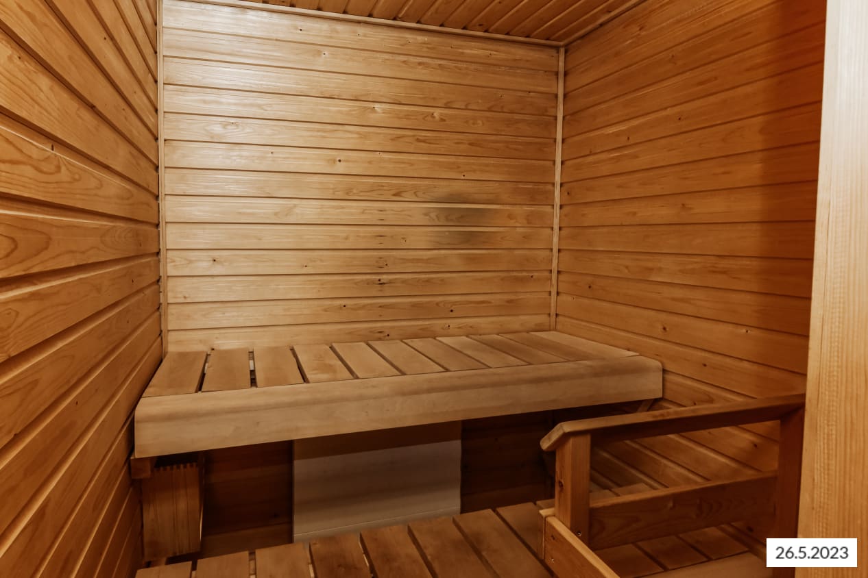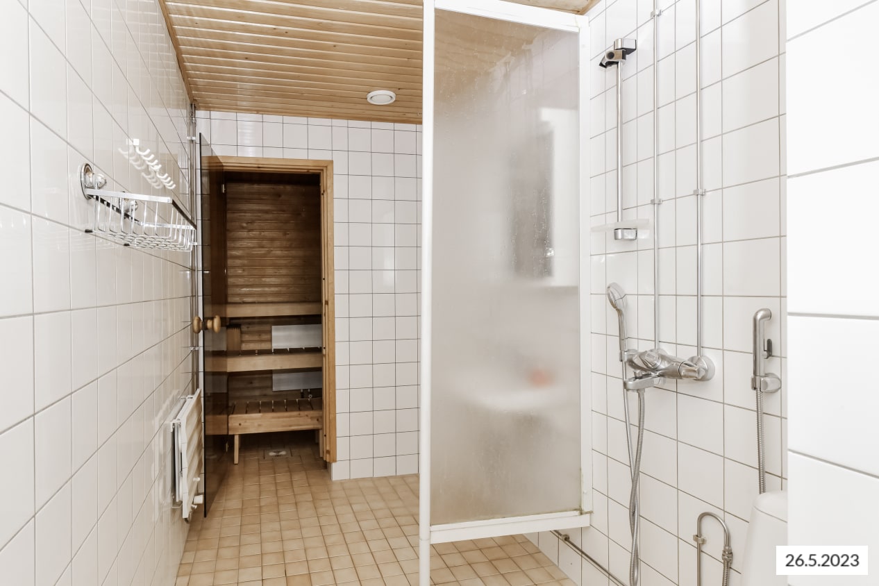 The bathroom includes space and connections for a washing machine. As the cherry on top, there's a private sauna perfect for unwinding after a workday.