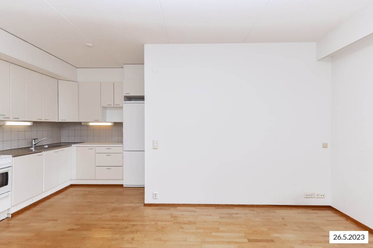 The heart of the home is the bright living area formed by the kitchen and living room, with windows opening onto the balcony. The kitchen is equipped with a cooker and freezer-refrigerator, and there's room for your dishwasher.