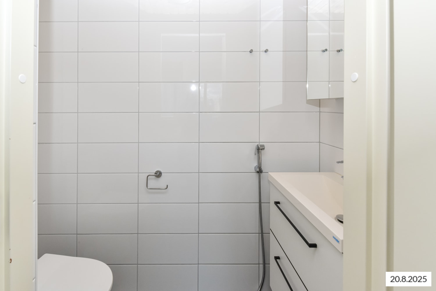 The kitchen cabinets are crisp white, with grey laminate between the upper and lower cabinets and on the countertops. The kitchen is equipped with a dishwasher, ceramic hob, and freezer-refrigerator. In the bathroom, you will find white Finnish-made Kide collection furniture. The walls are tiled in white and the floor is grey. There is space for a washing machine and tumble dryer.