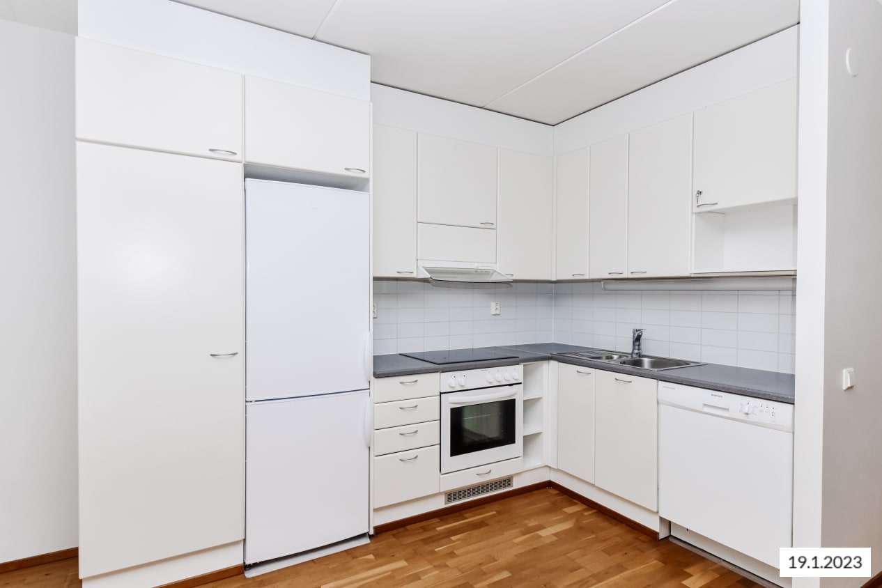 The living areas feature oak parquet floors. The bathroom includes underfloor heating, stylish gray floor tiles, and large white wall tiles. The kitchen has a dark gray laminate countertop, white cabinets, and gray backsplash tiles from Kaakelikeskus. Standard appliances include a fridge-freezer, dishwasher, and ceramic cooktop with a built-in oven. The kitchen cabinets also have space reserved for a microwave.