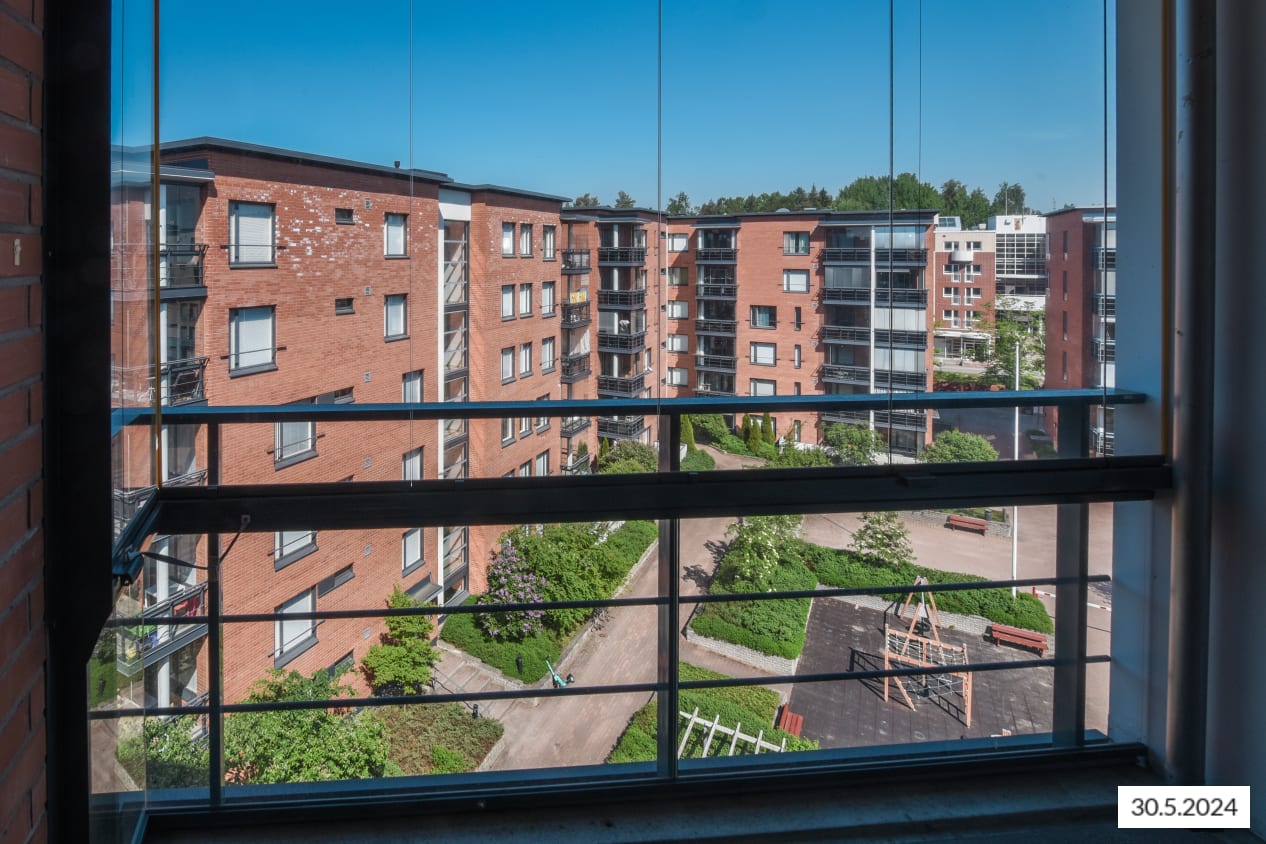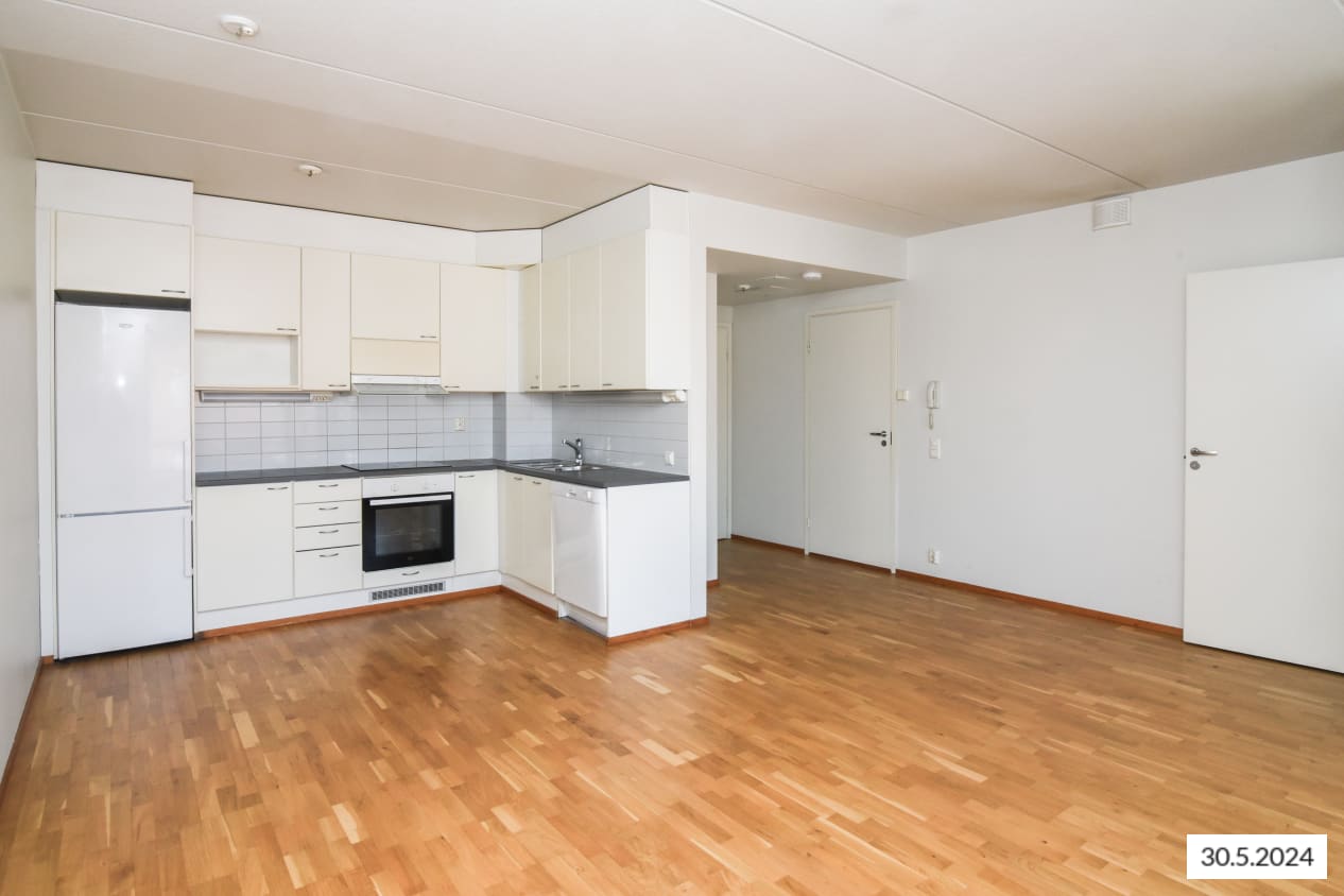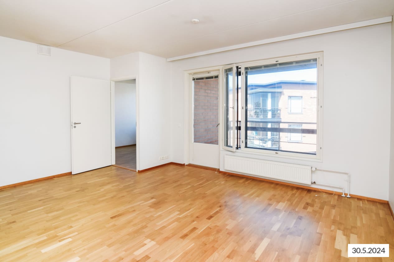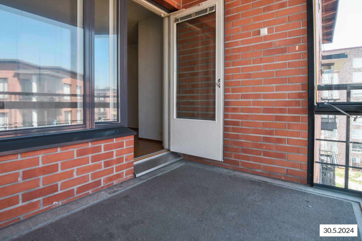 The layout of this top floor one-bedroom home includes many lovely details. The living room wall opposite the bedroom is ideal for a TV or display cabinet, and there is space for a small workstation next to the entrance. The peaceful home's balcony offers a spacious view over the yard. The rooms feature oak parquet or laminate flooring.