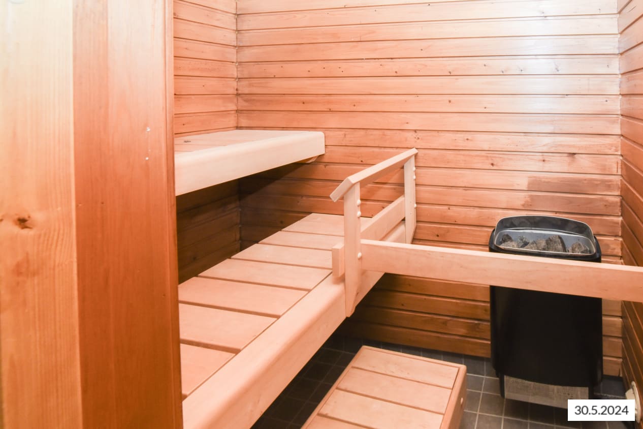 The bathroom features underfloor heating, understated grey floor tiles, and large white wall tiles. The cherry on top? Your own private sauna.