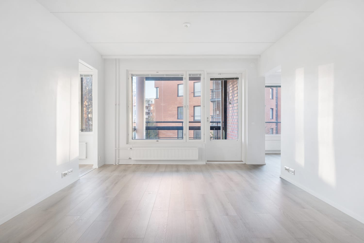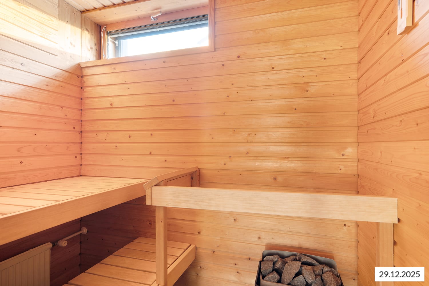 The cheerful corner apartment features a homely kitchen with enough space for a proper dining table. The living room is the focal point of the home, while the bedrooms offer a peaceful retreat. The balcony, which opens towards the yard, is perfect for summer evenings, and the private sauna is particularly delightful in winter.
