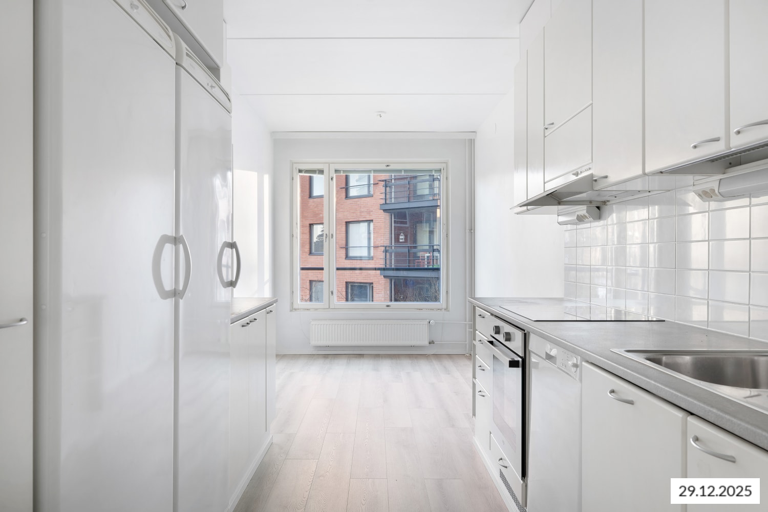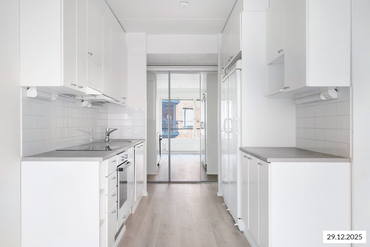 The living areas have oak parquet or laminate flooring. The bathroom boasts underfloor heating, subtle grey floor tiles, and large white wall tiles. The kitchen is equipped with a stylish dark grey laminate worktop, white cabinets, and grey tiling from Kaakelikeskus between the units. Standard appliances include a large refrigerator, a separate freezer, a dishwasher, and a ceramic hob with a built-in oven. The kitchen cabinets have space reserved for a microwave oven.