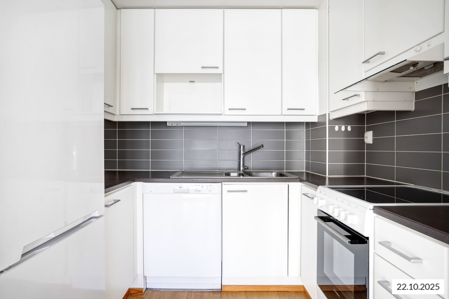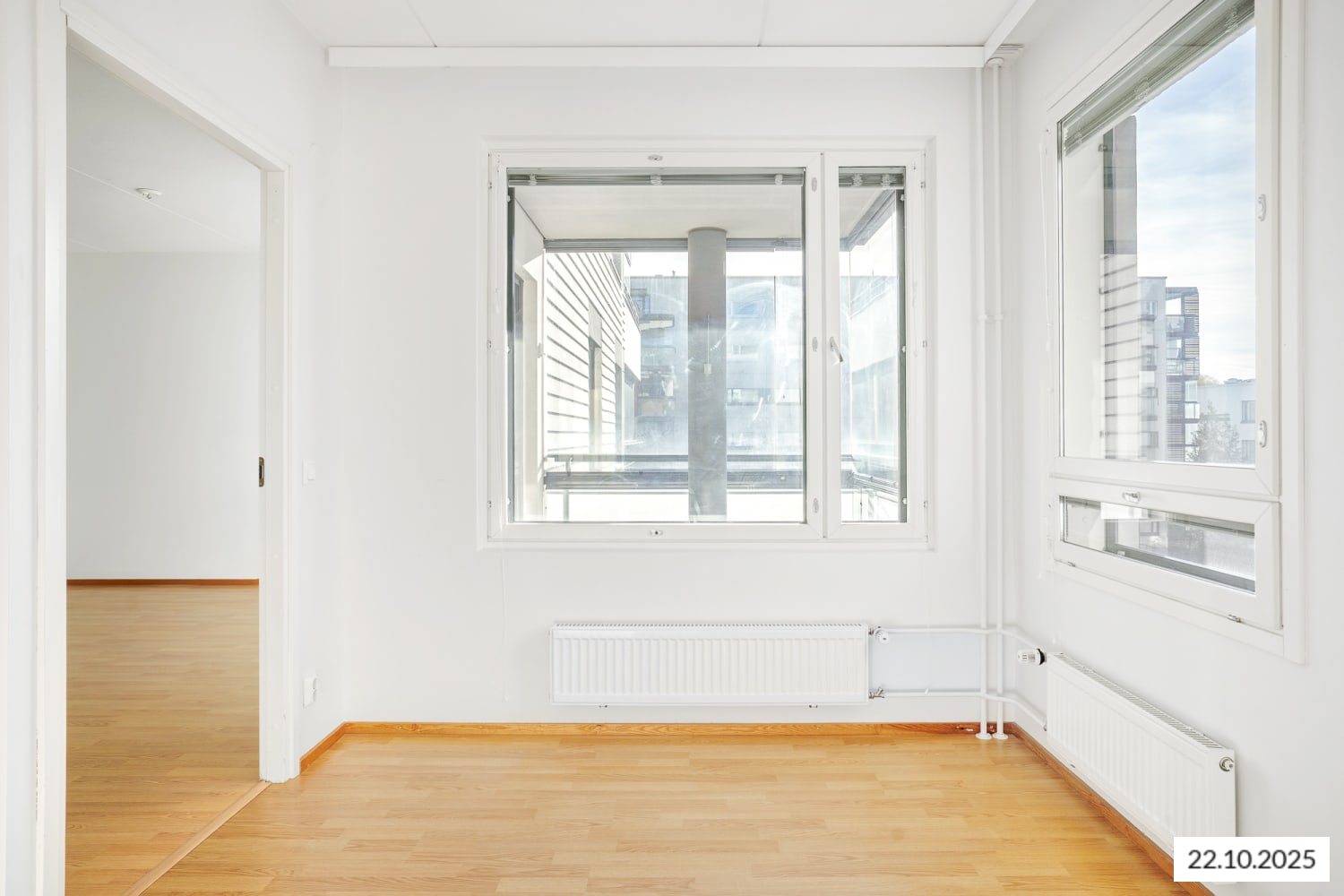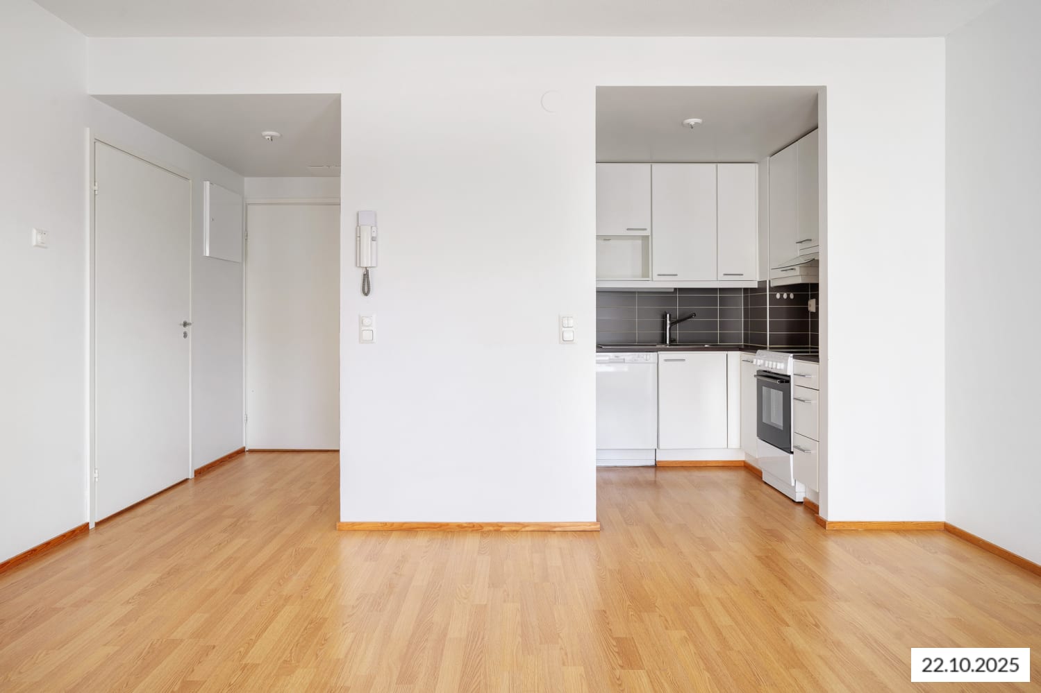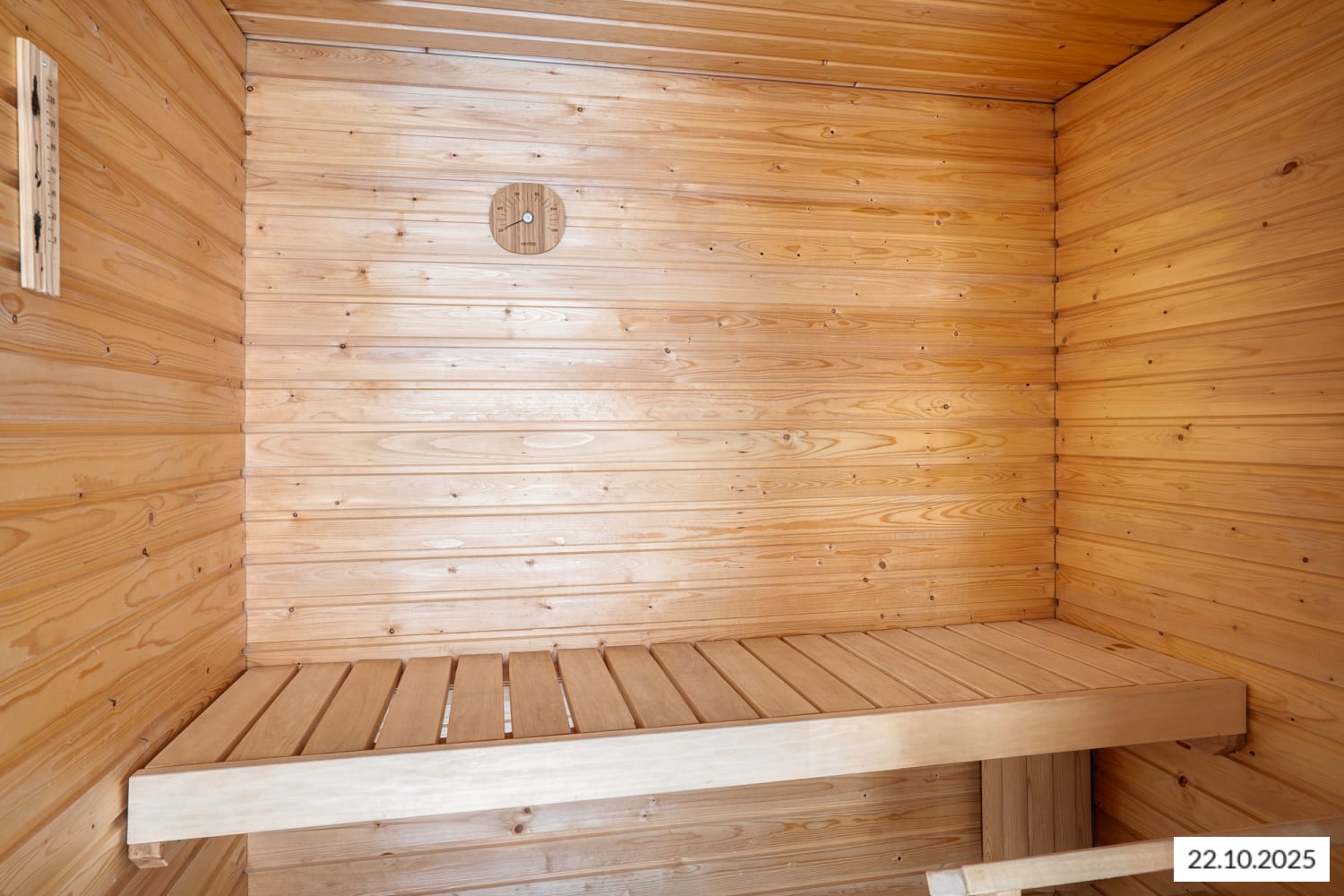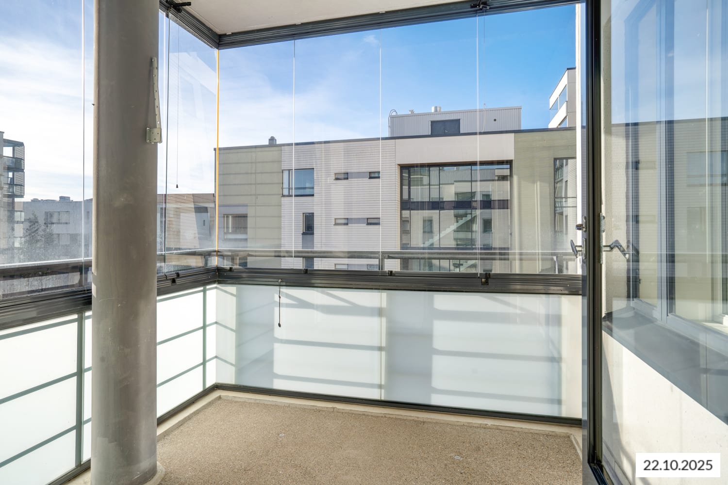 The charming small one-bedroom home's best features include its own sauna and a lovely sunny west-south facing glazed balcony. The compact, clearly structured layout makes furnishing easy, and the windows offer a peaceful view over the elevated yard above street level.