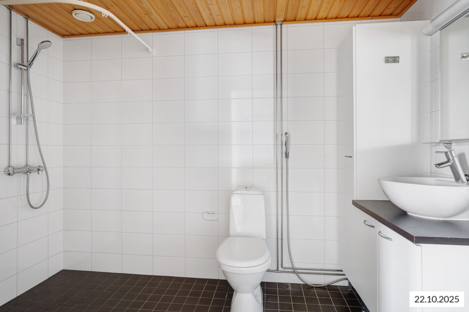The flooring in the living rooms is easy-to-maintain oak laminate. The streamlined bathroom has white wall tiles, dark grey floor tiles, and comfortable underfloor heating.