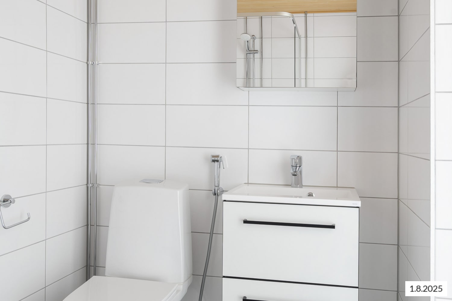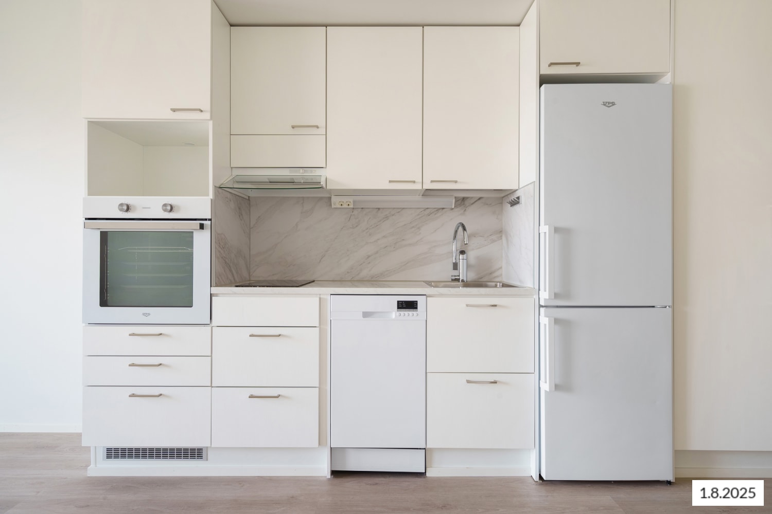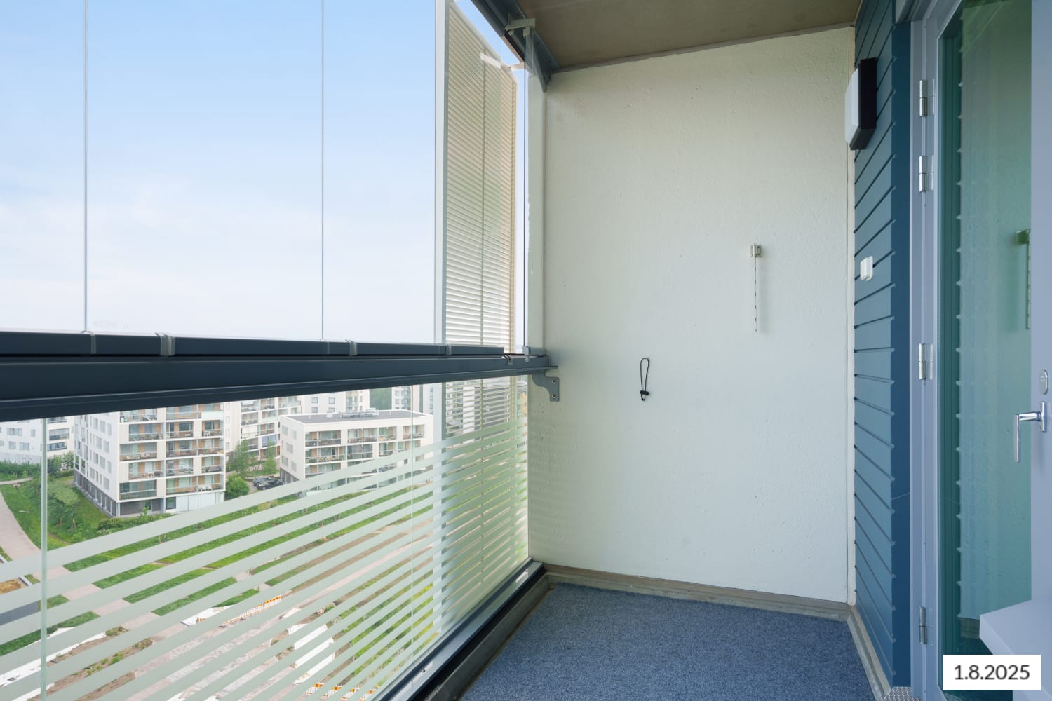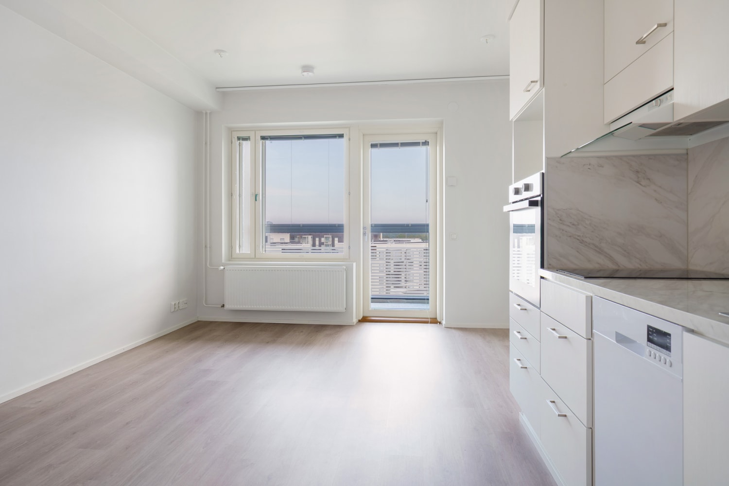 The light-filled home has a smart layout with plenty of potential ways to furnish the space just the way you like it. This totally new apartment is extended by a glassed-in balcony spanning the entire width of the space and with a view towards the sea in the direction of Helsinki and Vermo harness racing track. This home makes use of every square metre. The compact studio has a functional open-plan kitchen and wardrobe space in the entrance hallway. The home’s surface materials are timelessly beautiful, and the light colour scheme provides a neutral backdrop for any decor style. The open-plan kitchen has fresh white cabinet doors and marble-look laminate worktops. The kitchen is equipped with a ceramic cooktop, built-in oven, dishwasher, cold appliances and space for a microwave. The bathroom comes with white Kide range furniture designed for SATO and made in Finland. The bathroom walls are done in white tiles, and the floor tiles are dark grey. The bathroom has space for a washing machine and dryer. Maybe this could be your new RentHome?