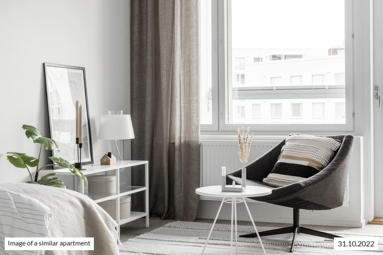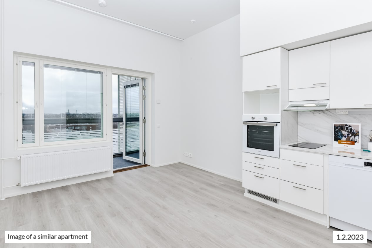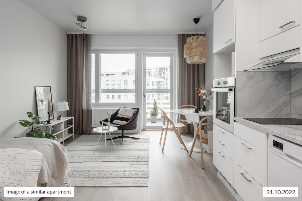 The light-filled home has a smart layout with plenty of potential ways to furnish the space just the way you like it. This totally new apartment is extended by a glassed-in balcony spanning the entire width of the space and with a view towards the sea in the direction of Helsinki and Vermo harness racing track. This home makes use of every square metre. The compact studio has a functional open-plan kitchen and wardrobe space in the entrance hallway. The home’s surface materials are timelessly beautiful, and the light colour scheme provides a neutral backdrop for any decor style. The open-plan kitchen has fresh white cabinet doors and marble-look laminate worktops. The kitchen is equipped with a ceramic cooktop, built-in oven, dishwasher, cold appliances and space for a microwave. The bathroom comes with white Kide range furniture designed for SATO and made in Finland. The bathroom walls are done in white tiles, and the floor tiles are dark grey. The bathroom has space for a washing machine and dryer. Now you get a free parking space for 6 months! Your rental agreement includes one free parking space for your car in the Runoratsu Parking Hall at Anna Sahlsteninkatu 11 (value €75 incl. VAT/month) for a period of six (6) months, when the agreement is signed between 22 January and 30 June 2026. After this, the parking agreement will automatically become paid, with a one-month notice period. The rental agreement is made with Kiinteistöhuolto Tahti. In addition, EV charging in the hall is subject to the standard €10/month fee and the electricity used for charging, both also during the first six months. Could this be your new RentHome?