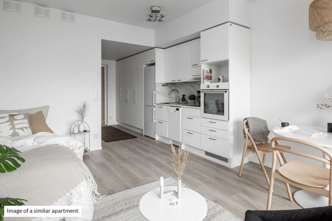 The light-filled little home has a smart layout with plenty of potential ways to furnish the space just the way you like it. The ample ceiling height of 3.3 m provides a great sense of space and volume. This totally new apartment is extended by a glassed-in balcony spanning the entire width of the space and with a view towards the sea in the direction of Helsinki and Vermo harness racing track. This home makes use of every square metre. The compact studio has a functional open-plan kitchen and wardrobe space in the entrance hallway. The home’s surface materials are timelessly beautiful, and the light colour scheme provides a neutral backdrop for any decor style. The open-plan kitchen has fresh white cabinet doors and marble-look laminate worktops. The kitchen is equipped with a ceramic cooktop, built-in oven, dishwasher, cold appliances and space for a microwave. The bathroom comes with white Kide range furniture designed for SATO and made in Finland. The bathroom walls are done in white tiles, and the floor tiles are dark grey. The bathroom has space for a washing machine and dryer. Maybe this could be your new RentHome?