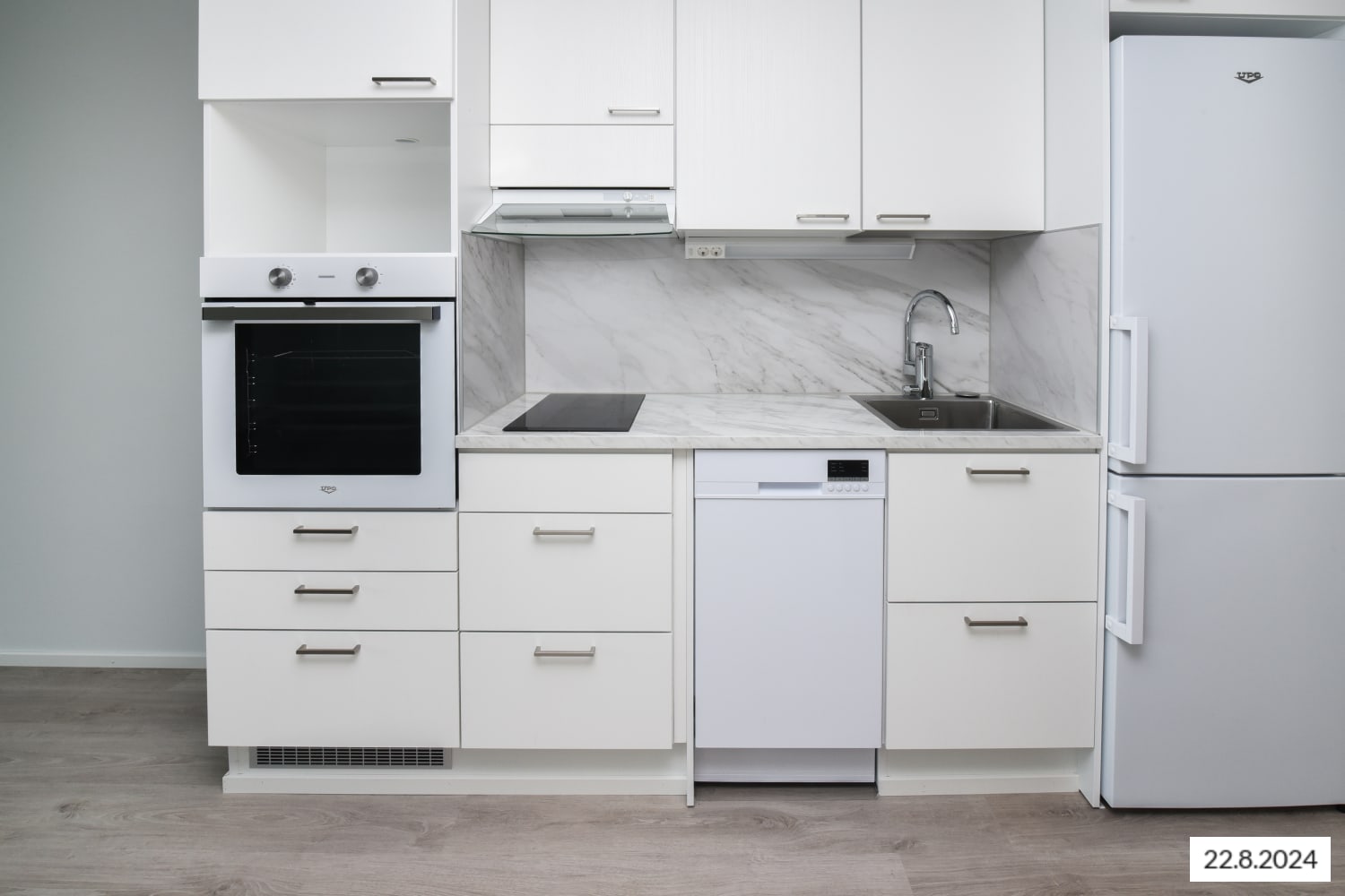 This home makes use of every square metre. The compact studio has a functional open-plan kitchen and wardrobe space in the entrance hallway. The home’s surface materials are timelessly beautiful, and the light colour scheme provides a neutral backdrop for any decor style. The open-plan kitchen has fresh white cabinet doors and marble-look laminate worktops. The kitchen is equipped with a ceramic cooktop, built-in oven, dishwasher, cold appliances and space for a microwave.