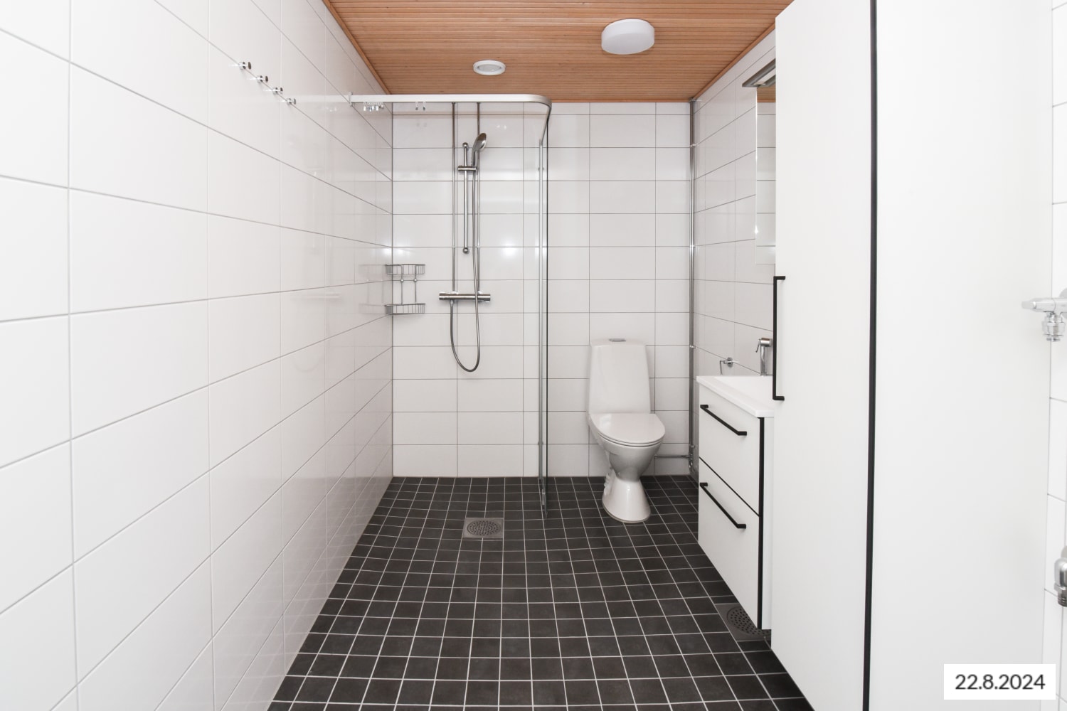 The bathroom comes with white Kide range furniture designed for SATO and made in Finland. The bathroom walls are done in white tiles, and the floor tiles are dark grey. The bathroom has space for a washing machine and dryer.