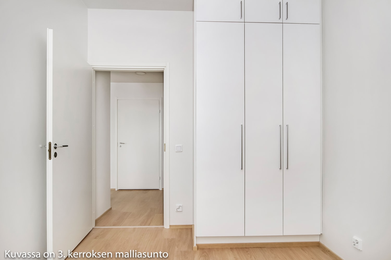 The floors in the living areas are laminate that mimics whitewashed oak planks. The kitchen and bathroom furniture, as well as the closets, are produced by the Finnish company Kankarin Kaluste. The hallway features a metal designer coat rack, which is SATO's own model. The kitchen cabinets are fresh white, and the space between the upper and lower cabinets, as well as the countertops, are gray laminate. The kitchen is equipped with a ceramic cooktop, built-in oven, dishwasher, and refrigerator, with a provision for a microwave. The bathroom walls are glossy white tiles, while the floors and accent walls are gray tiles. The bathroom furniture is from SATOn's own Kide collection. There is space and connections for a washing machine and dryer.