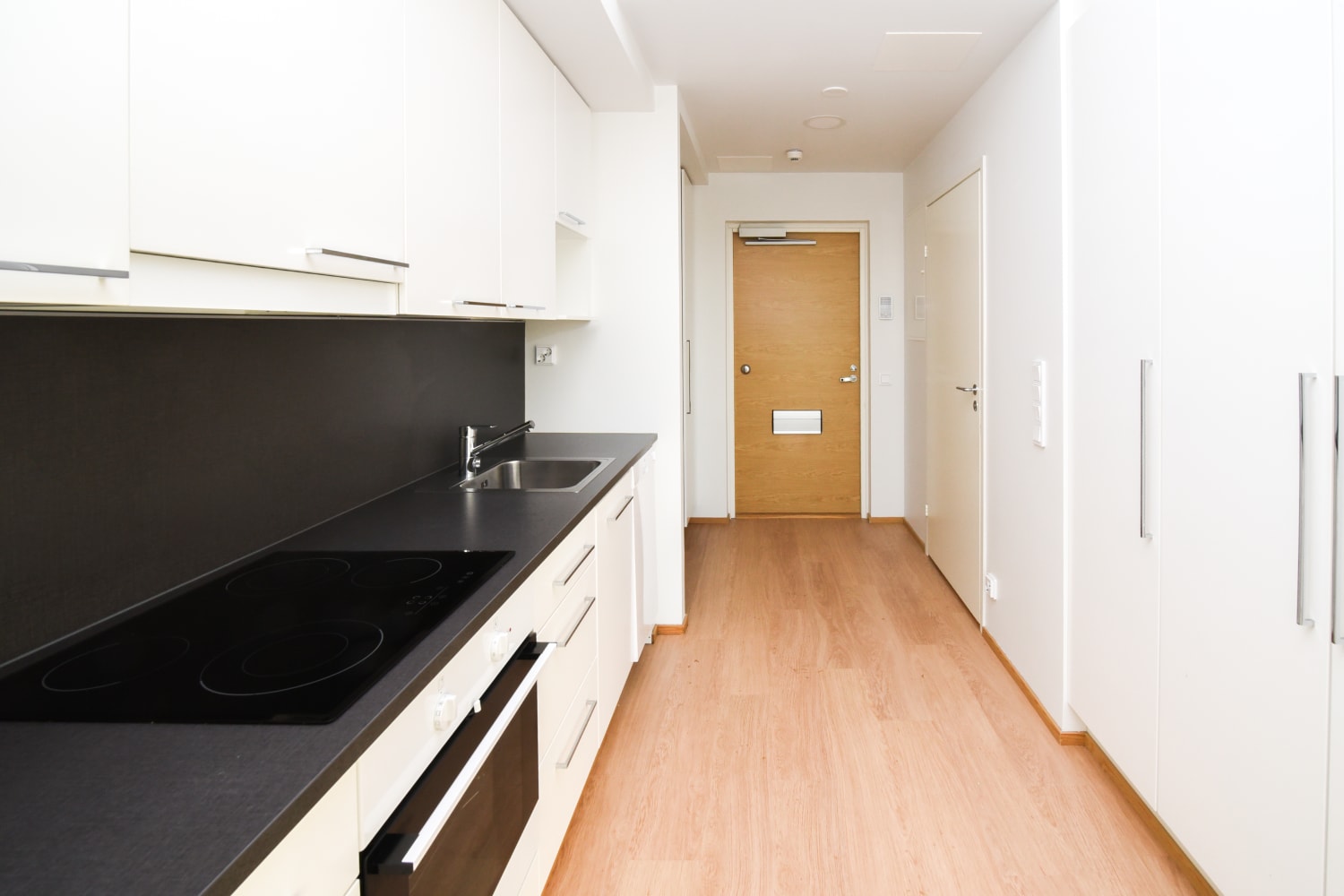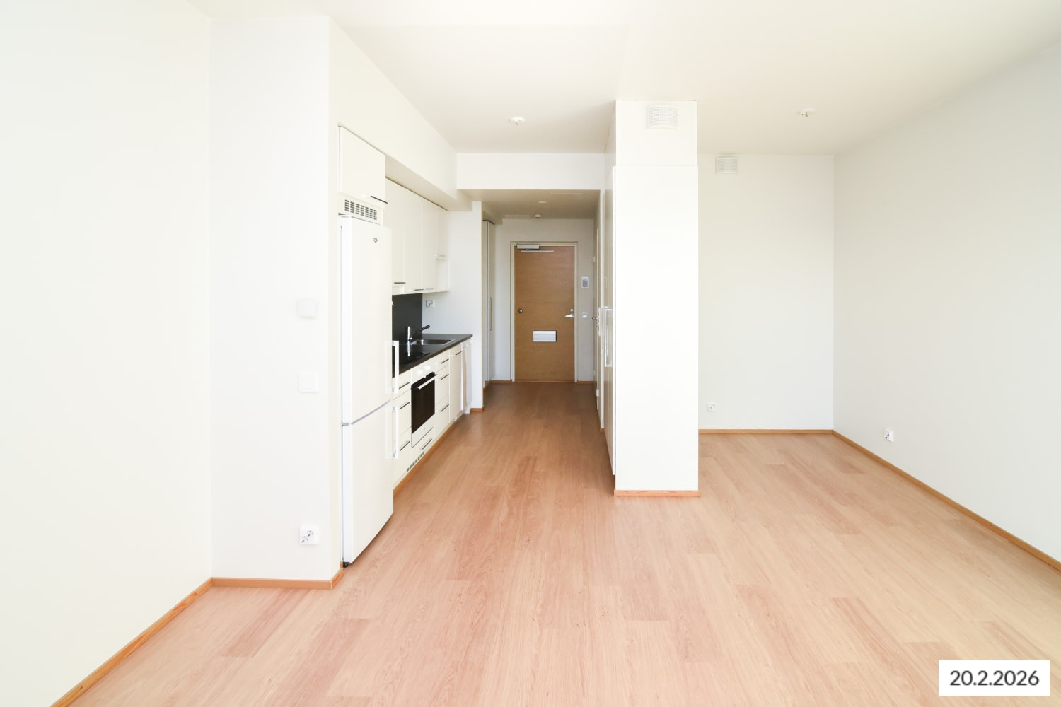 The living area floors are laminate that mimics whitewashed oak planks. The kitchen and bathroom fixtures and closets are made by the Finnish company Kankarin Kaluste. The hallway features a metallic design coat rack, exclusive to SATO. The kitchen cabinet doors are fresh white, with gray laminate countertops and backsplash between the upper and lower cabinets. The kitchen is equipped with a ceramic cooktop, built-in oven, dishwasher, and refrigerator, with space reserved for a microwave. The bathroom walls are glossy white tiles, and the floors and accent walls are gray tiles. The bathroom fixtures are from SATOs own Kide collection. There is space reserved for a washing machine and dryer. Could this be your next home?