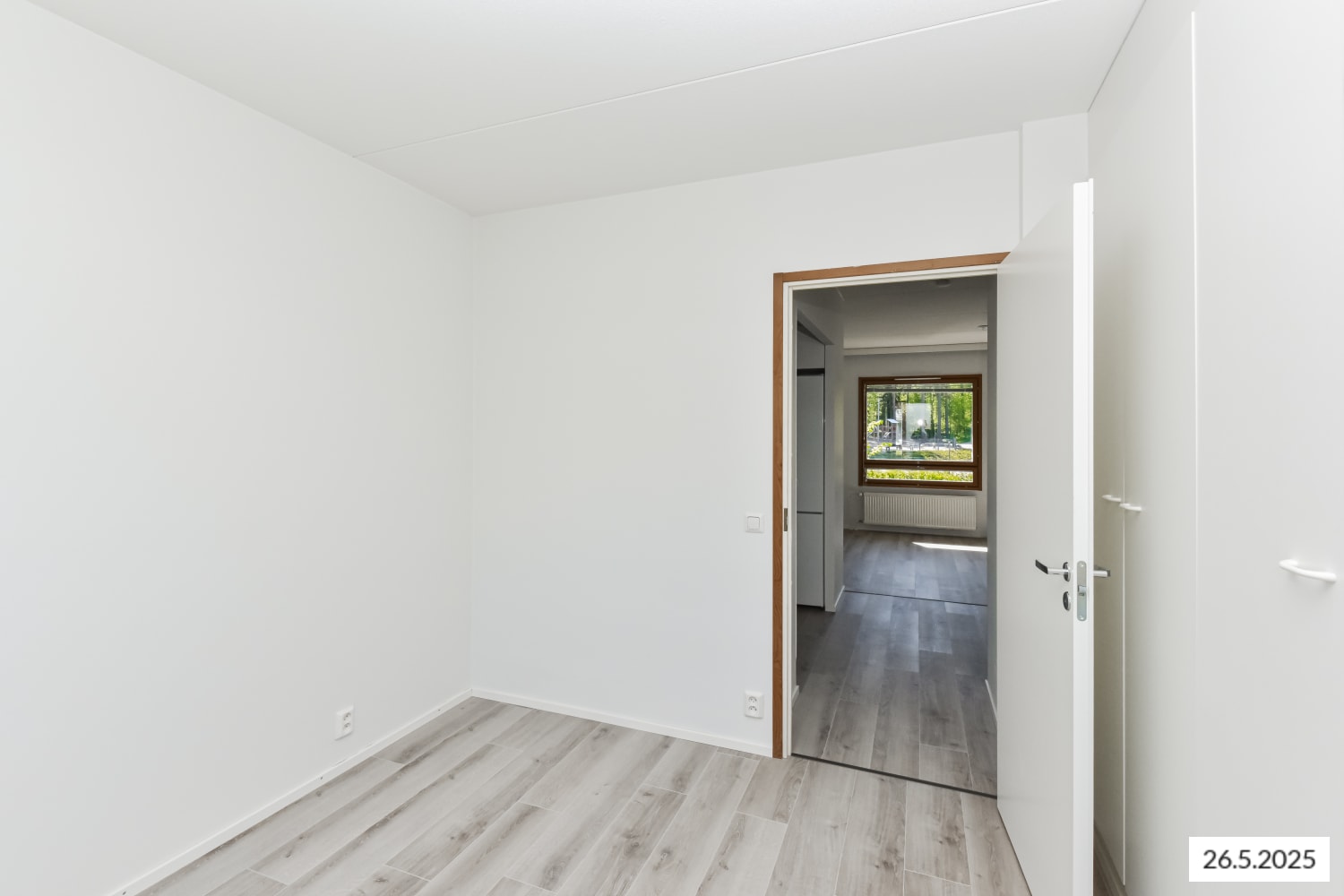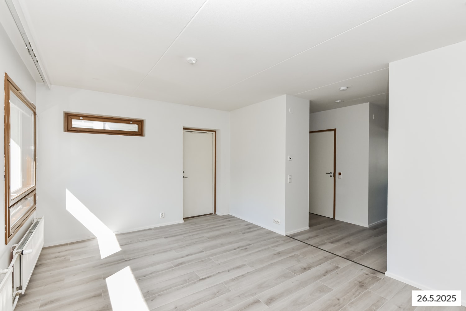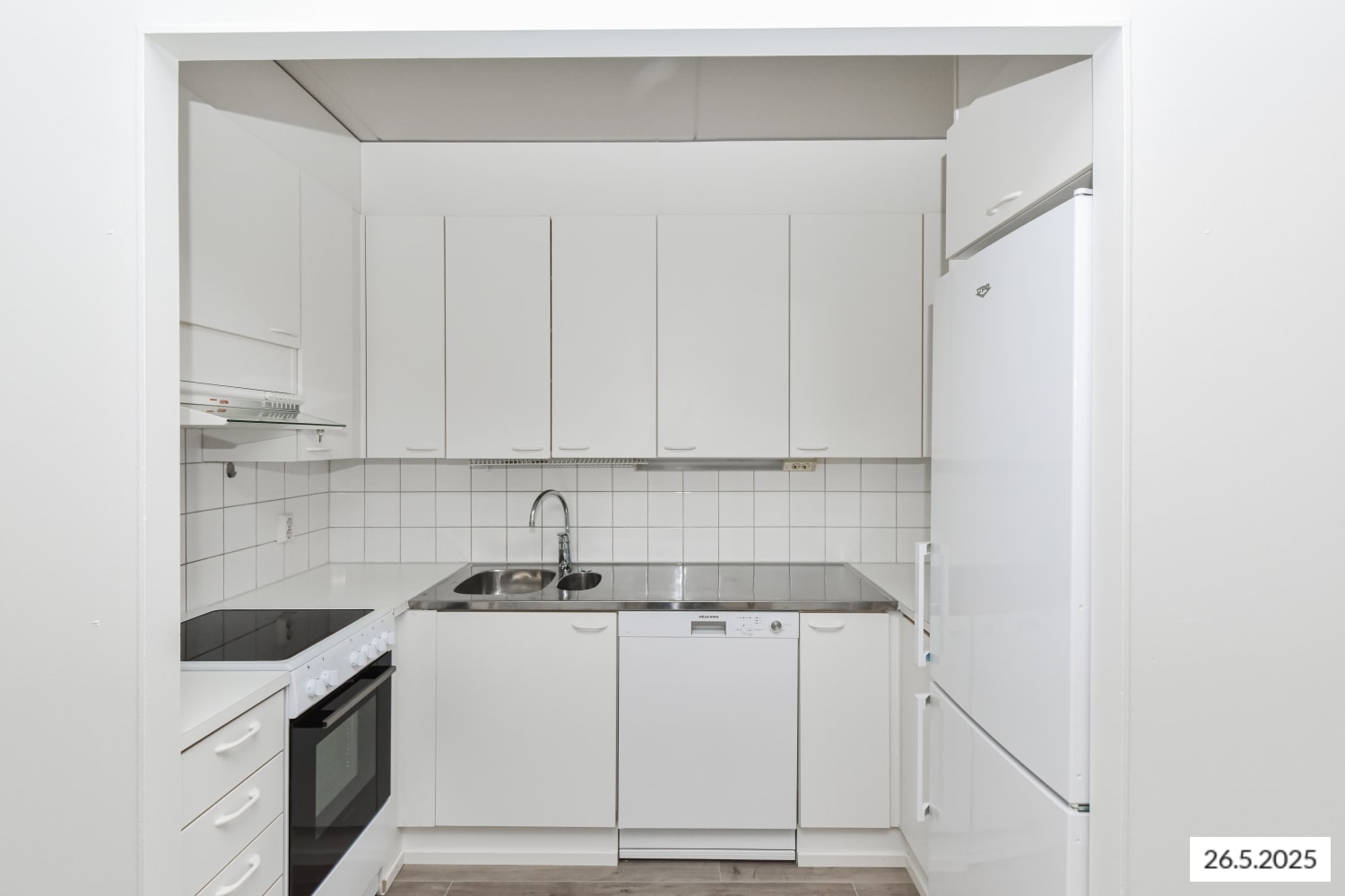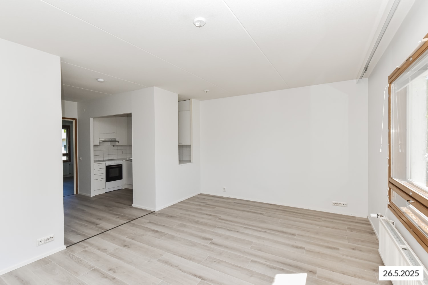 The kitchen, separated from the living area by a partition wall, is light-toned and equipped with a dishwasher, ceramic hob, and freezer-refrigerator. The living rooms have laminate flooring.