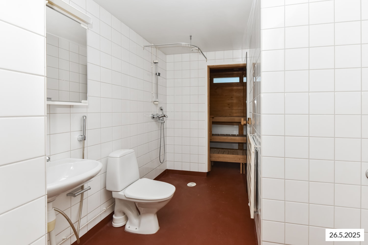 The bathroom features a reddish-brown floor and tiled walls, as well as a provision for a washing machine.