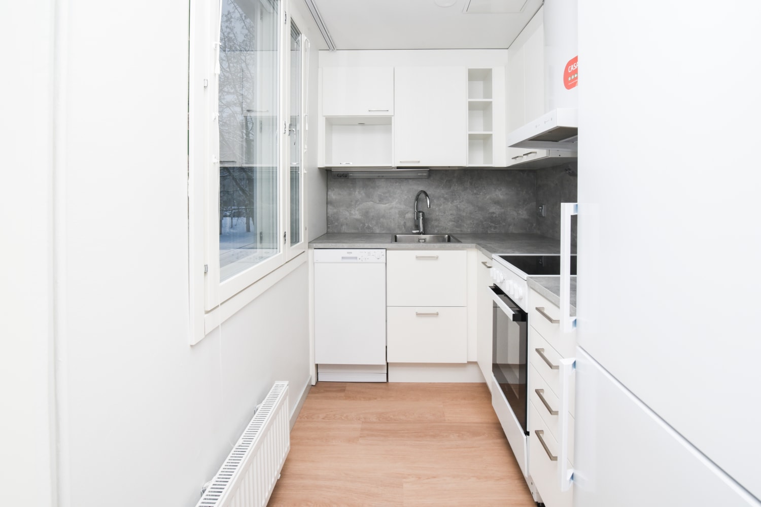 This renovated and charming studio is easy to furnish into your own cosy home. The flooring is oak-effect laminate, and the walls are painted white. The separate kitchenette features fresh white cabinets, with a grey laminate backsplash and countertops. The kitchen is equipped with a ceramic hob, cooker hood, and fridge-freezer, all in white. A window brings natural light and a sense of openness to the space.