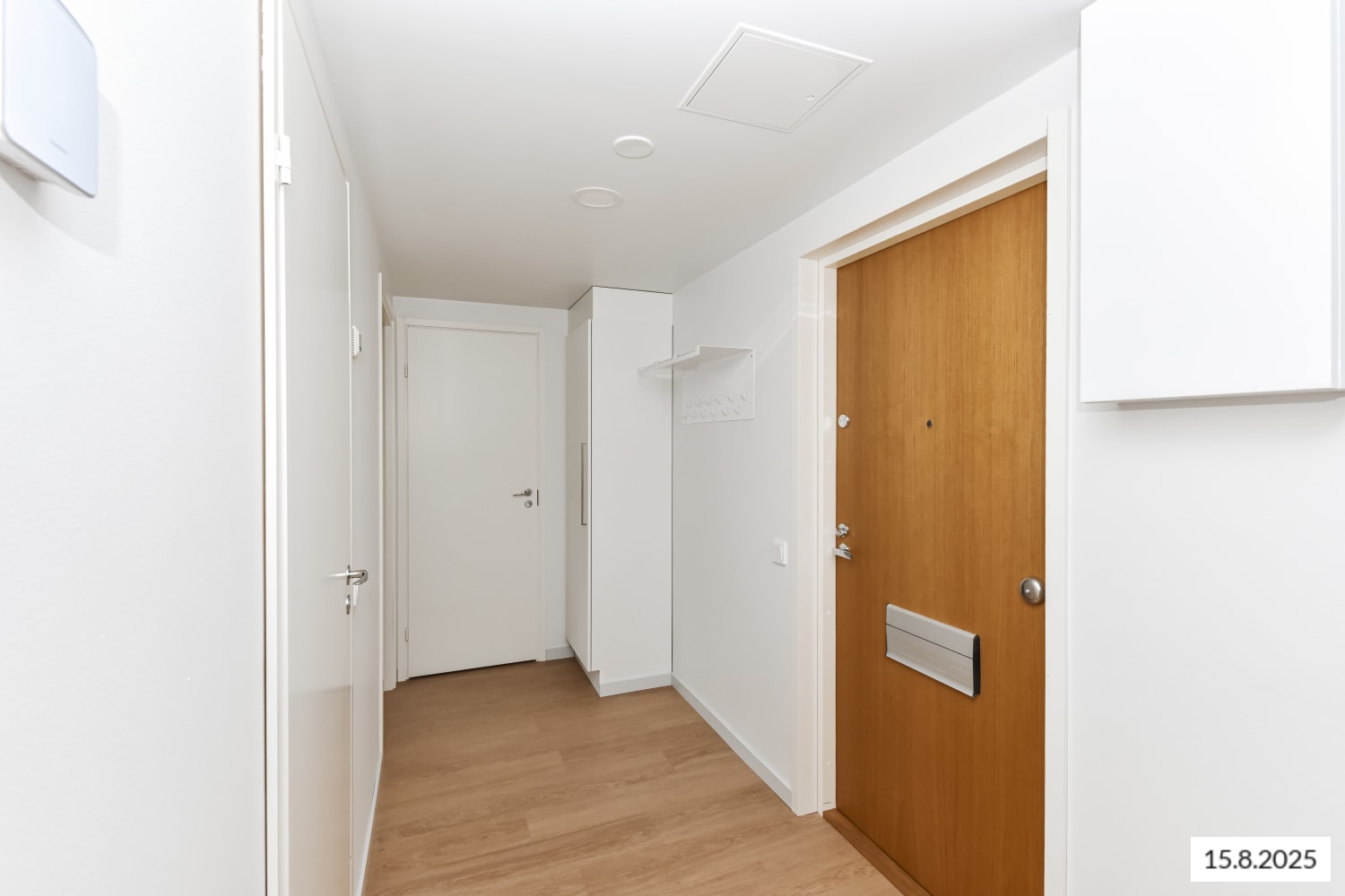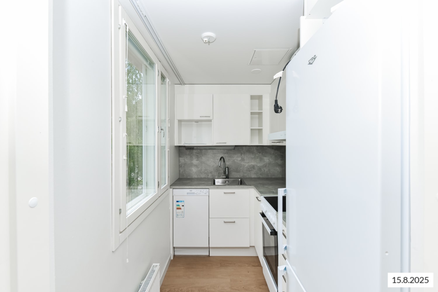 The interior materials of the apartments are light-colored and timeless. The floors are oak laminate and the walls are painted white. The kitchen units have white cabinets. The space between the top and bottom cabinets and the worktop are gray laminate. The equipment includes a ceramic hob, cooker hood, fridge-freezer and dishwasher. Kitchen appliances are white. The furniture in the bathroom is from SATO's Kide collection. Their material is a very durable and beautiful white solid laminate. The bathroom walls are white tile and the floor tiling is gray. There is space for a washing machine.
