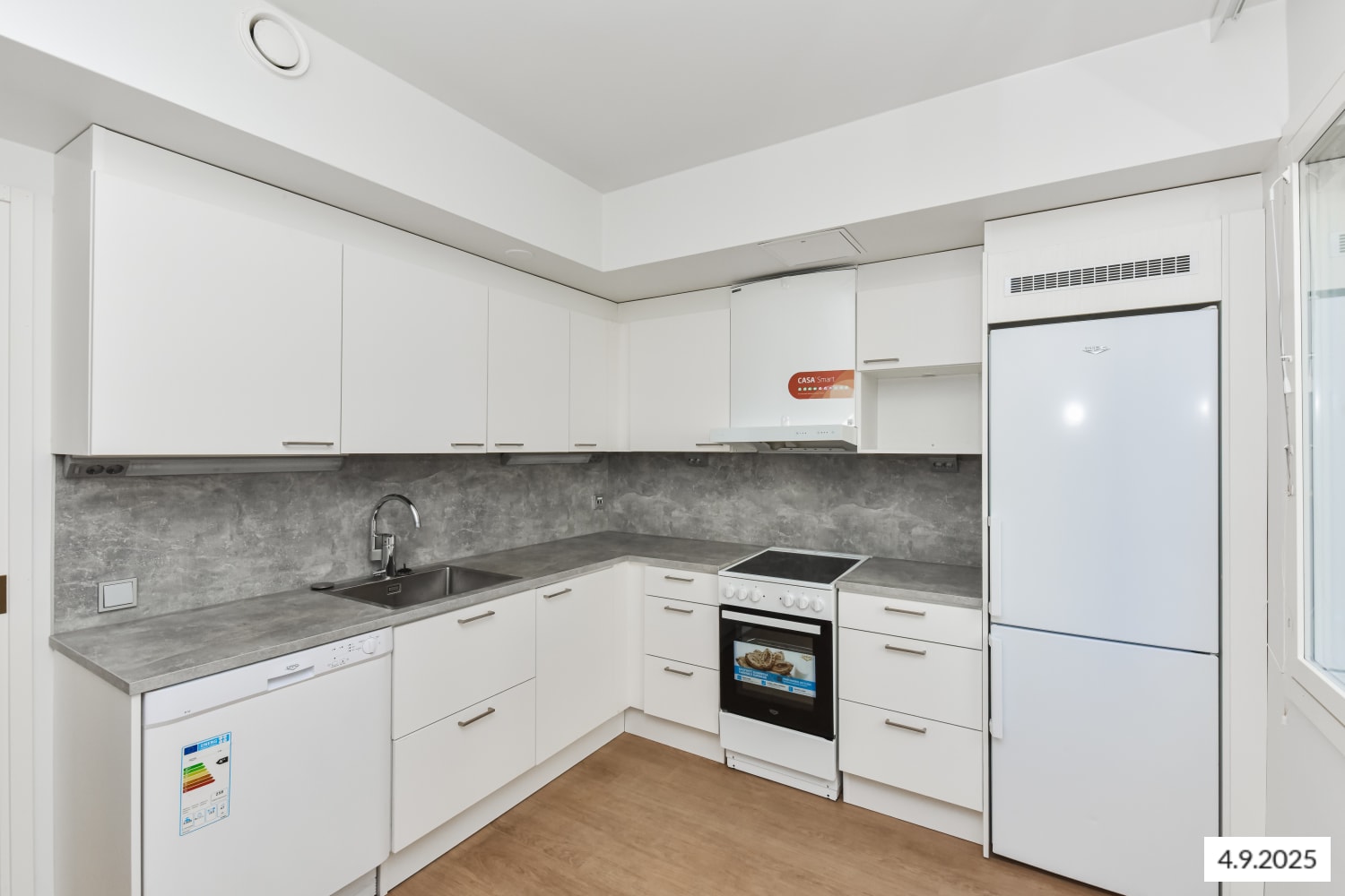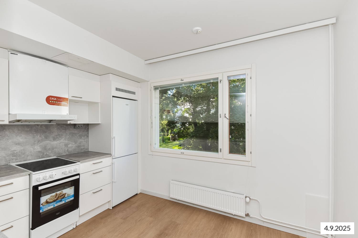 The generously sized separate kitchen offers plenty of space for cooking and dining. The kitchen cabinets are a fresh white, and the space between the upper and lower cabinets, as well as the work surface, is grey laminate. The kitchen equipment includes a ceramic hob, cooker hood, and freezer-refrigerator. The appliances are white.