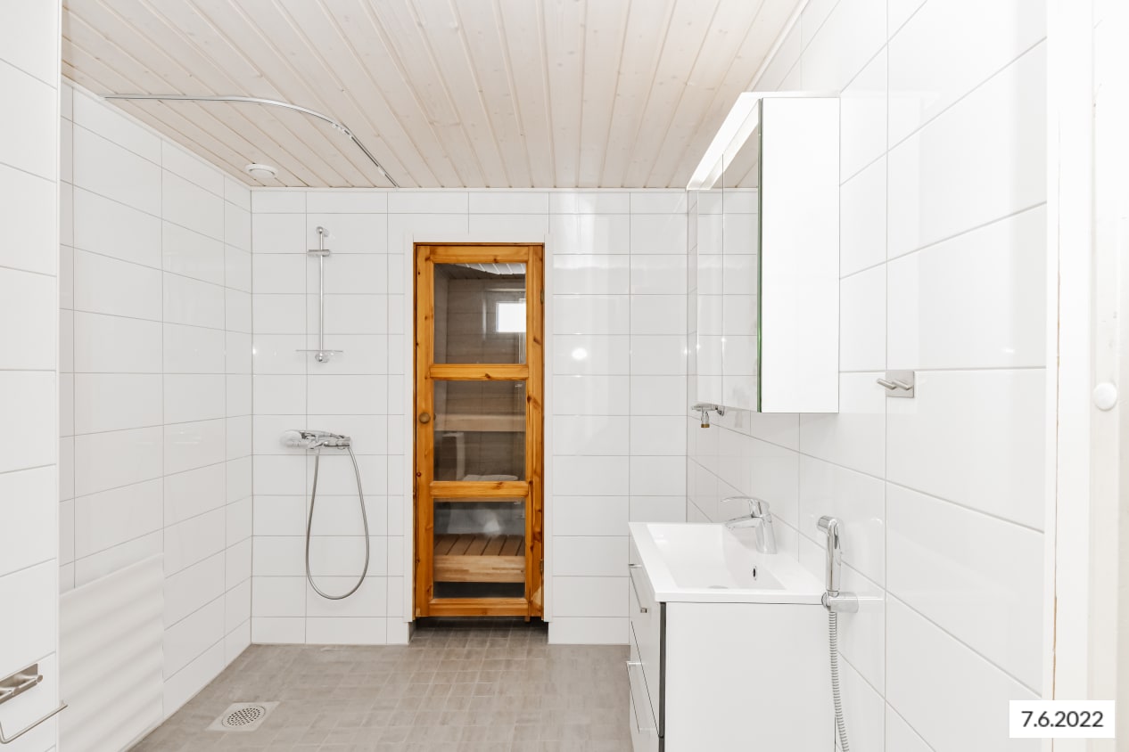 The bathroom has space and connections for your washing machine. The home is crowned by a private sauna with a ventilation window, allowing you to relax whenever it suits you best. Storage space is available in the bedroom cupboards.