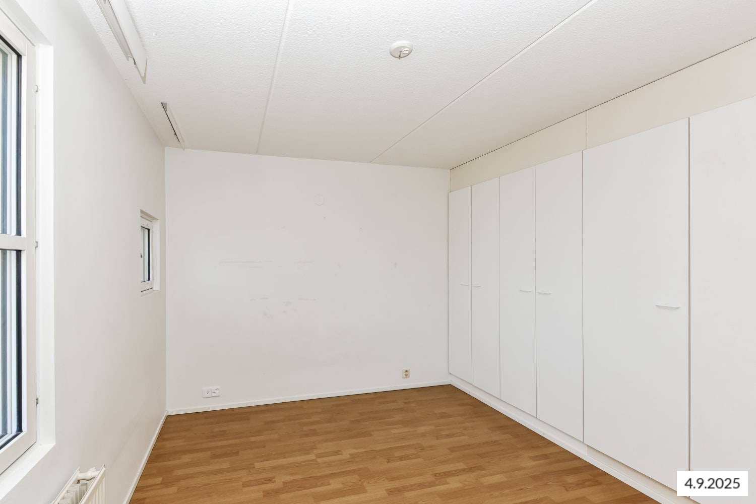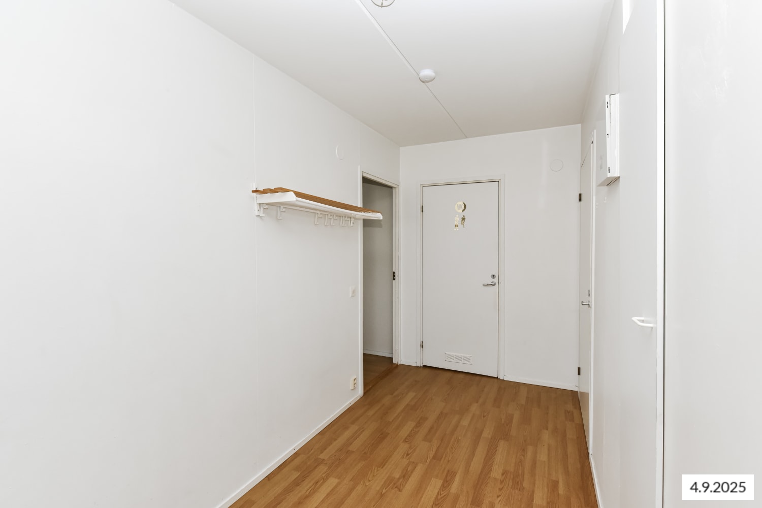 The bathroom is fitted with white furnishings from SATO's Kide collection, and there is a provision for your washing machine. Storage space is available in the bedroom cupboards.
