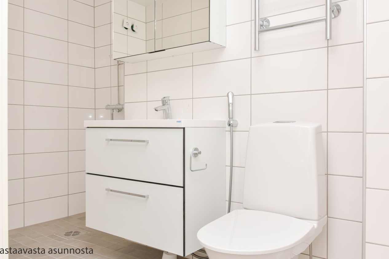 The bathroom features domestic furniture from the Kide collection in white. The walls are tiled in white, and the floor is grey. There is a designated space for a narrow washing machine (doorway approximately 57 cm).