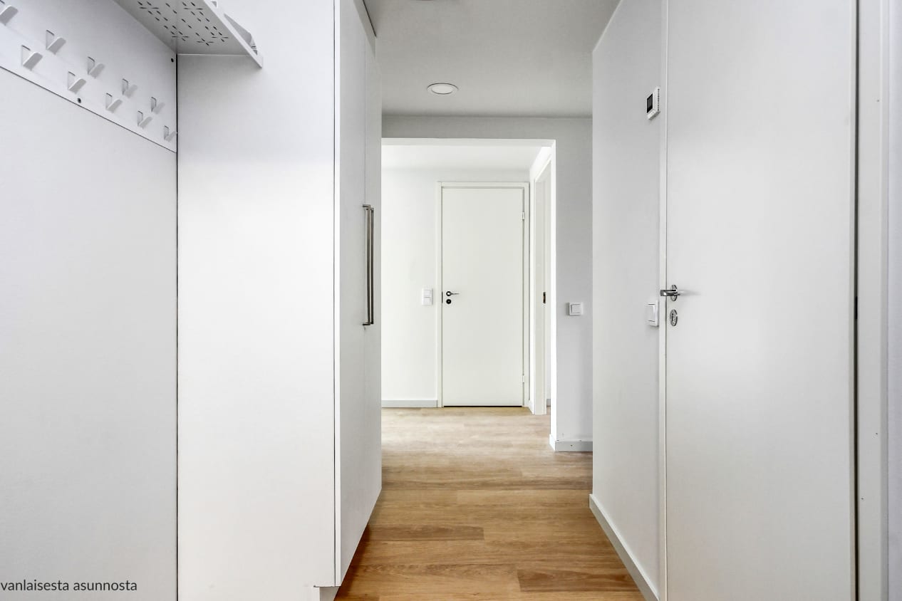Renovated, spacious one-bedroom home opens up to two directions. Thanks to the clear layout, you can easily furnish the home to reflect your personal style. The floor is oak laminate and the walls are painted white. Extending from the living room is a glazed balcony.