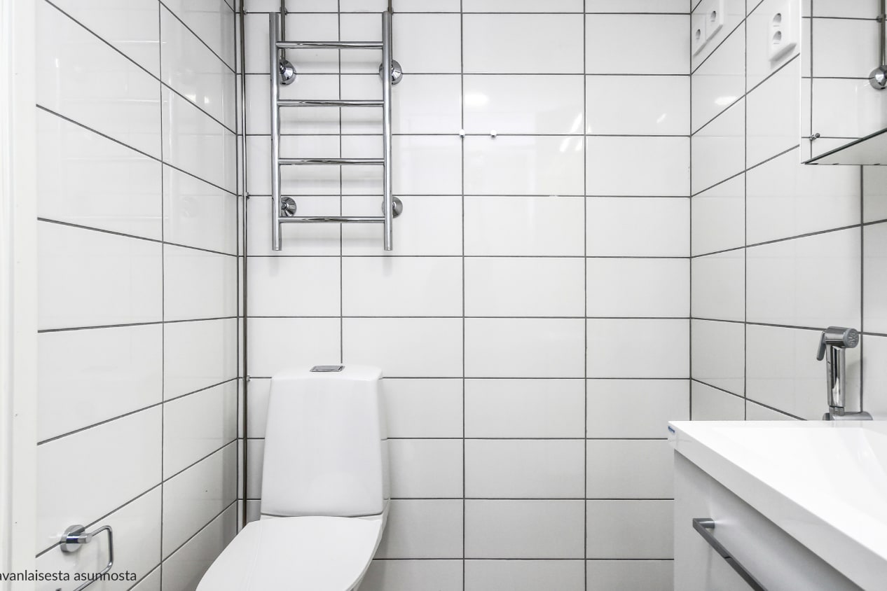 The bathroom features domestic furniture from the Kide collection in white. The walls are white tiles and the floor is grey. There is a designated spot for a washing machine. There is ample space for clothing storage in the separate walk-in wardrobe.