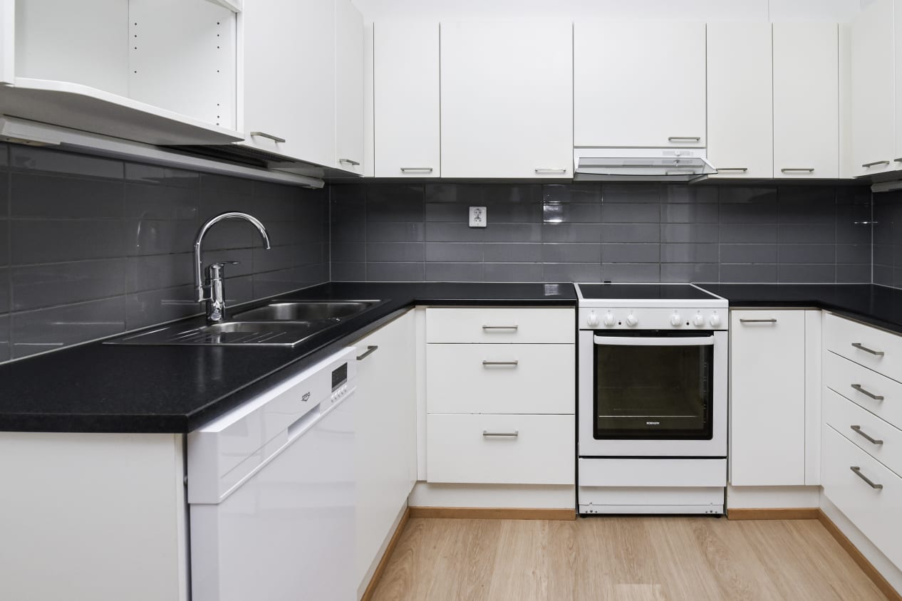 The living room floors are made of bleached oak laminate. The kitchen cabinets are white with a black laminate worktop and a matte grey tiled splashback. Amenities include a dishwasher, ceramic hob, and freezer-refrigerator.