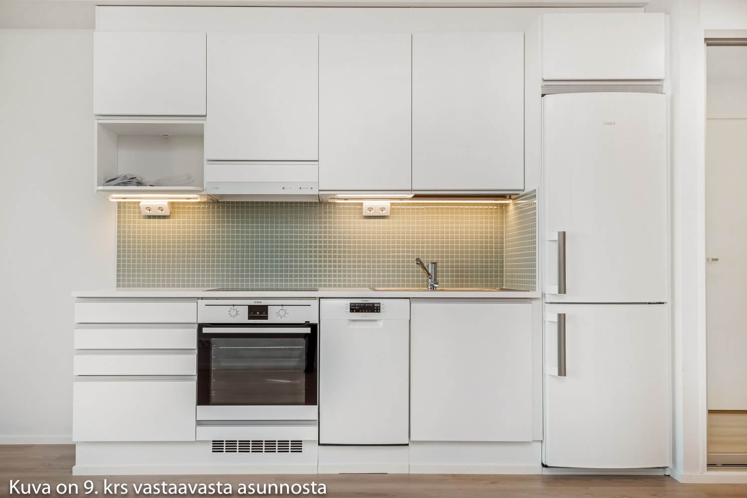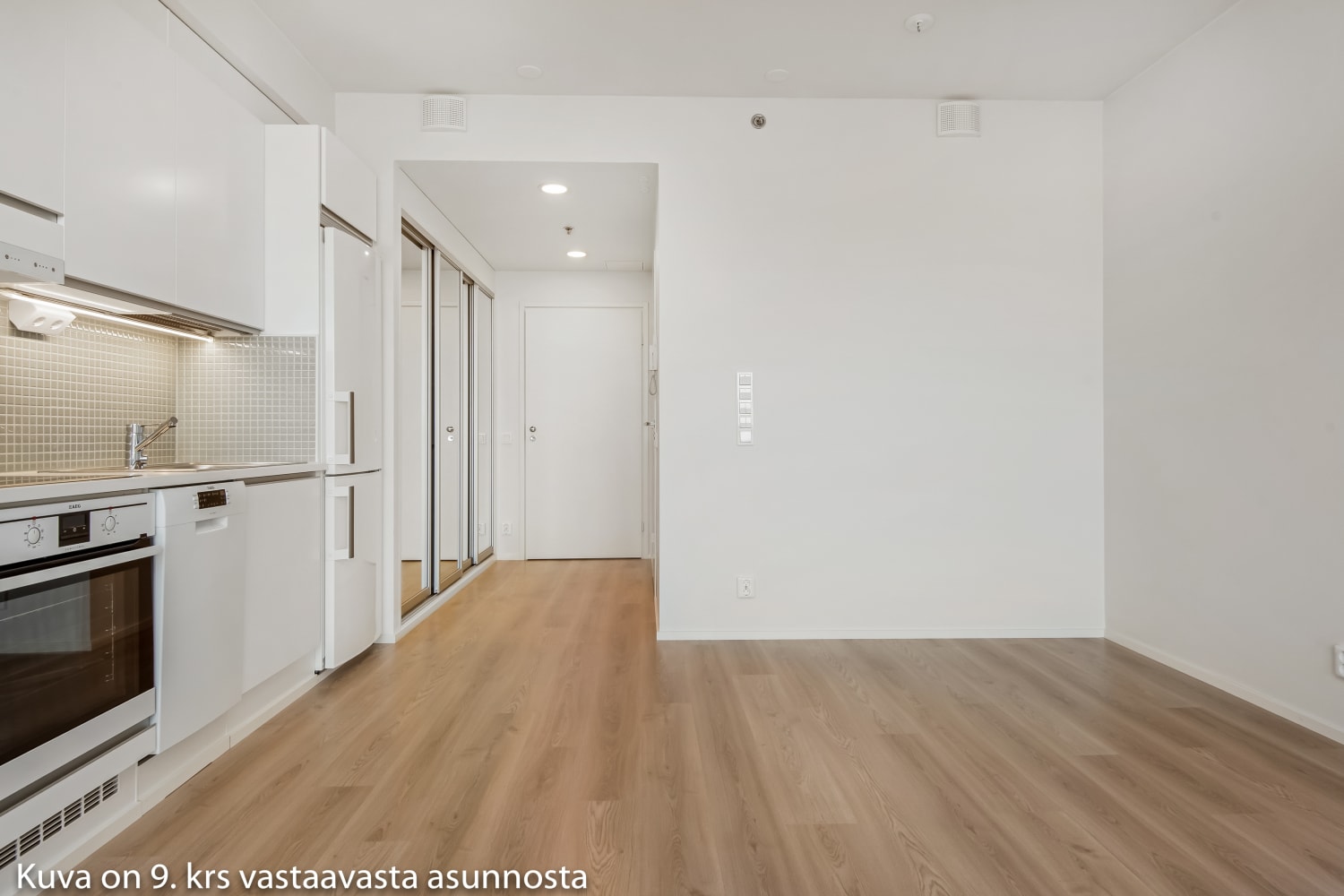 The living area floors are a warm oak-colored laminate. The bedroom has white wardrobes, and the hallway's sliding door closets have mirrored doors. In the kitchen, the cabinet doors are fresh white, with a backsplash tiled in light green. The countertop is clean white laminate. The kitchen is equipped with a ceramic cooktop and separate oven, a dishwasher, and a fridge-freezer. The fully tiled bathroom is done in light tones, and there's space for both a washing machine and a dryer.