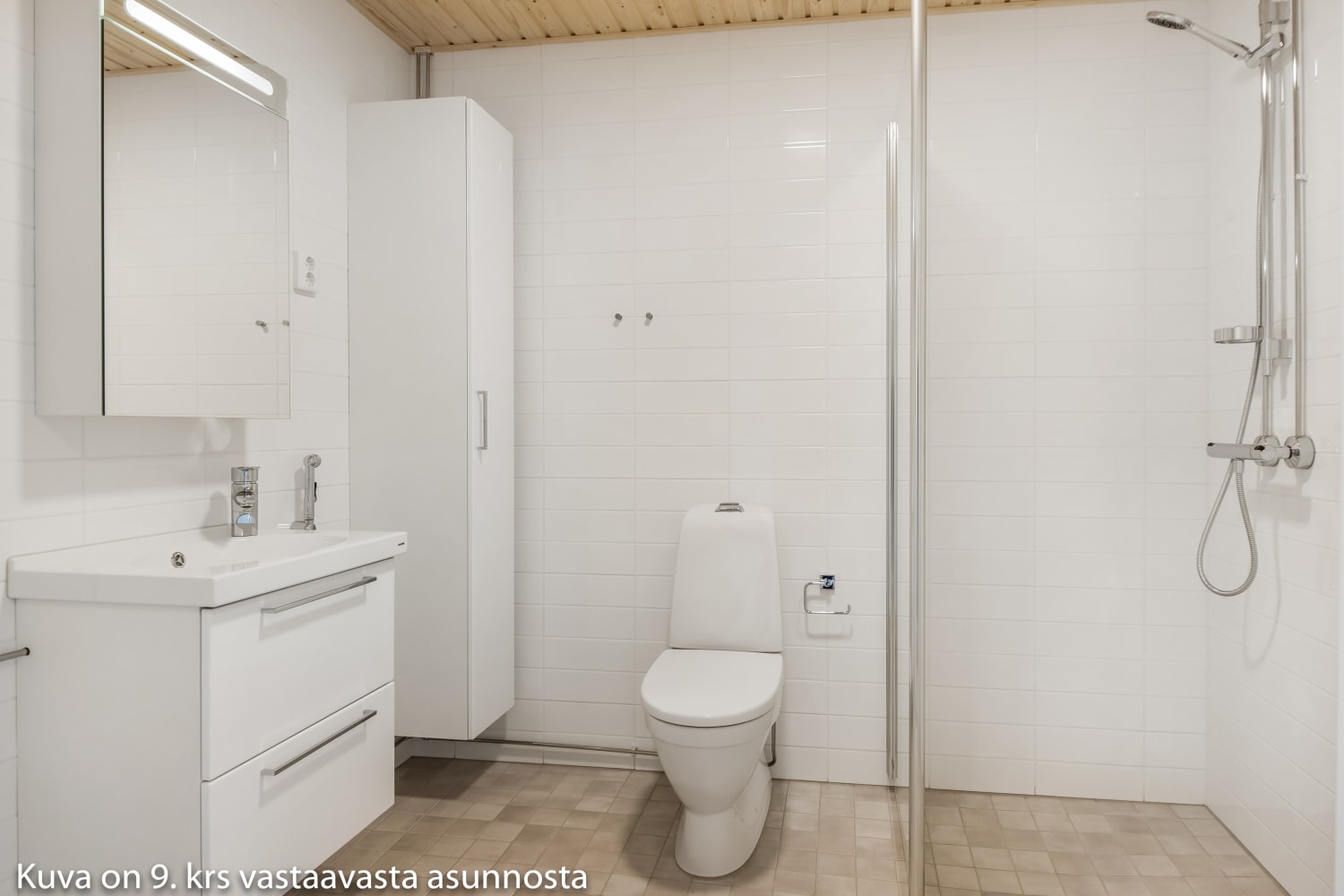 This high-rise studio apartment features an open and practical layout. The cabinets are neatly arranged along one wall, leaving the other side as an open space that can be easily furnished to your taste. The glazed balcony, facing Merituulentie, is perfect for a small potted garden or a cozy spot to enjoy your coffee.
